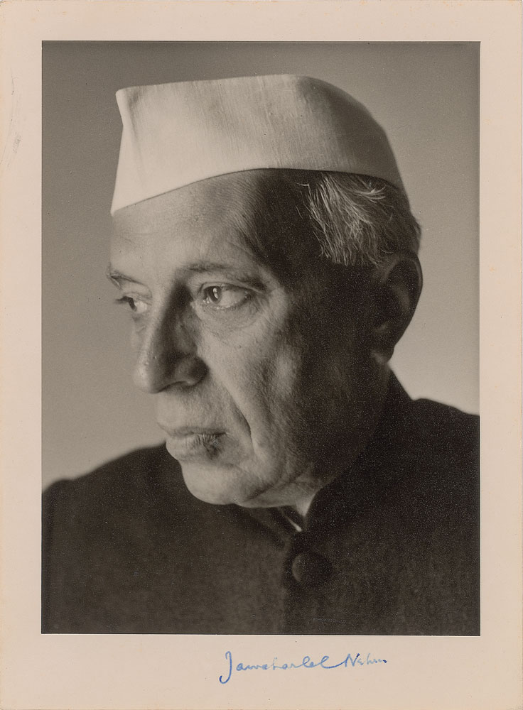 Political leader (1889-1964) who served as first Prime Minister of India from 1947 until his death. Vintage matte-finish 6 x 8 close-up portrait of Nehru in a solemn profile pose, signed in the lower border in blue fountain pen. In fine condition.