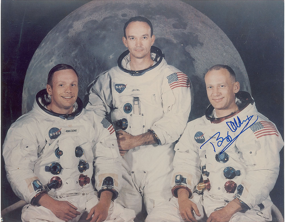 Color semi-glossy 13.75 x 10.75 photo of the crew of Apollo 11 posing in their white space suits against a lunar backdrop, signed in blue felt tip by Buzz Aldrin. In fine condition, with some light scratching to the emulsion. Originally obtained by in-person specialist Mike Wehrmann.