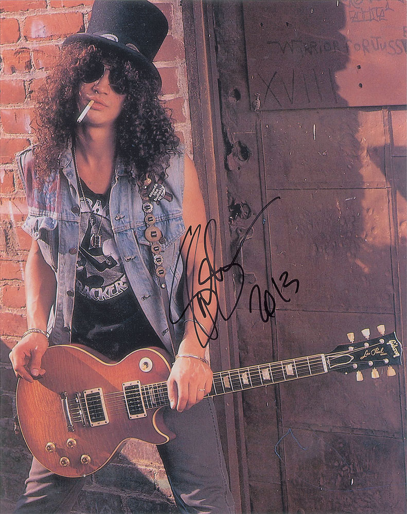 Color satin-finish 11 x 14 photo of Slash smoking a cigarette with his Gibson Les Paul slung over his shoulder, signed in black felt tip, "Slash, 2013." In fine condition. Originally obtained by in-person specialist Mike Wehrmann.