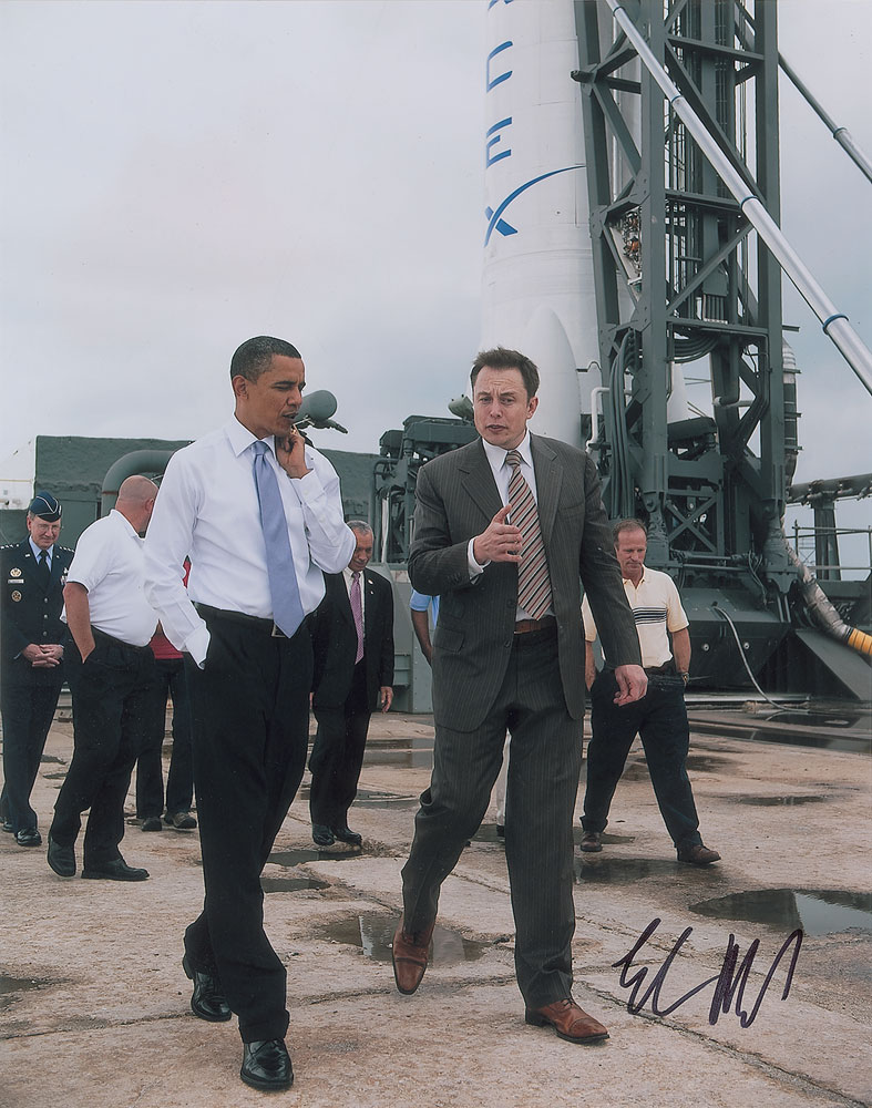 Color satin-finish 11 x 14 photo of SpaceX CEO Elon Musk showing President Barack Obama around the company's Cape Canaveral rocket processing site in 2010, signed in black felt tip by Musk. In fine condition.
