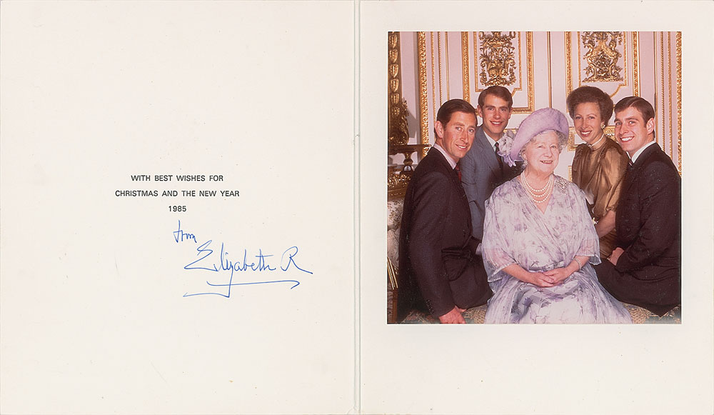 Christmas card from 1985 featuring an embossed royal crown on the front, measuring 15 x 8.75 open, with a photo of the Queen Mother surrounded by her four adult grandchildren, signed inside below a printed Christmas and New Year’s greeting in blue ink, “from Elizabeth R.” In fine condition.