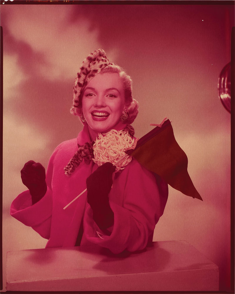 Original vintage color 8 x 10 Kodak Ektachrome transparency of Marilyn Monroe taken by Tom Kelley in a 1951 photo shoot for City Club Shoes. The appealing image shows Monroe in a red winter coat and leopard-print hat, holding a pennant over her shoulder. A slightly different image from the shoot was ultimately used in the City Club Shoes advertisement, cropped to Monroe's face—this is likely an unpublished outtake. Kelley is best known for his 1949 'Red Velvet' nudes of Monroe. In fine condition.
