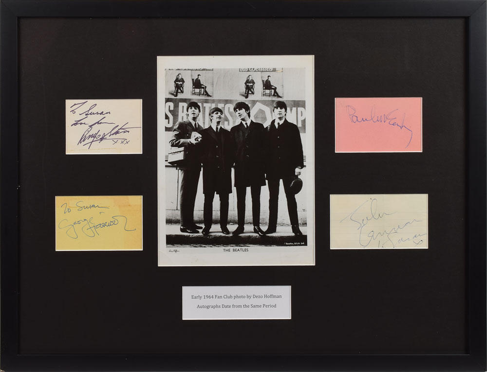 Appealing set of Beatles signatures on multicolored cards ranging in size from 3.5 x 2.5 to 4.5 x 2.5, each individually signed in ballpoint or felt tip, with three inscribed: "To Susan, Love from, Ringo Starr, xxx," "To Susan, George Harrison," "Paul McCartney," and "John Lennon, to Susan, x." Matted and framed with a Dezo Hoffman photo of the Beatles to an overall size of 22.5 x 17.25. In overall very good to fine condition, with irregular light toning to Harrison, and creasing and a partially matted-out inscription to Lennon.