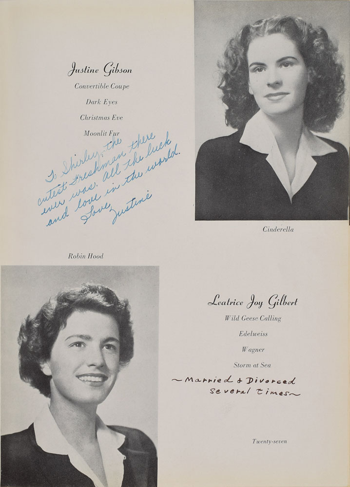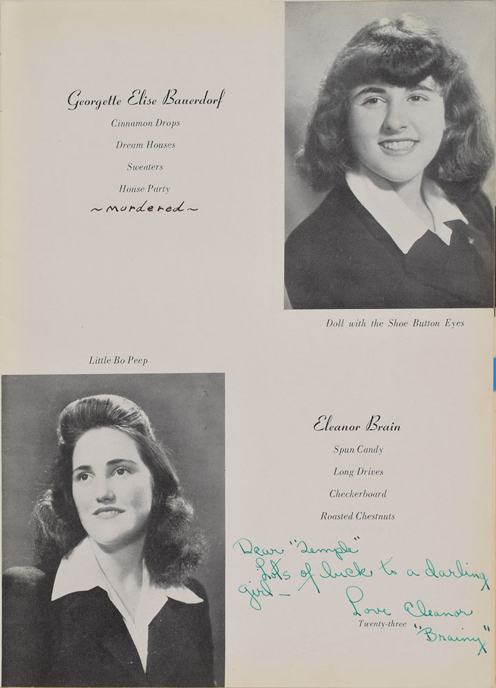 Shirley Temple's 1941-42 Westlake School for Girls 'Vox Puellarum' yearbook, 8 x 10.75, 145 pages, with front cover personally embossed, "Shirley Temple." The 14-year-old Temple is pictured twice on page 64, once by herself sitting on a sofa, and immediately below with another girl and a soldier, with Temple adding in ink below, "Rrrough!!!" Temple has added ink notations throughout the yearbook noting whether a person was "married," and then on occasion, to whom; under one name, that of Georgette Elise Bauerdorf, Temple has added "murdered." Also pictured in the yearbook is June Lockhart as a member of the junior class, and a very young Elizabeth Montgomery as a member of the primary class. In fine condition. Accompanied by a certificate of authenticity from the Shirley Temple Black Family's Partnership. A unique, personal piece from the child actress's own collection.