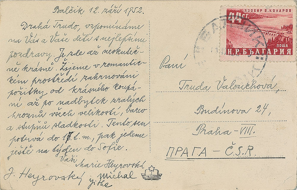 Czech chemist (1890-1967) who won the 1959 Nobel Prize for his discovery and development of polarographic analysis. Vintage ink signature, “J. Heyrovsky,” penned at the bottom of a letter written by his wife in Czech, one page on the reverse of a 5.5 x 3.5 postcard, September 12, 1952. Untranslated letter concerning the family's holiday in Sofia, Bulgaria. Each member of the Heyrovsky family has signed at the conclusion. In fine condition.