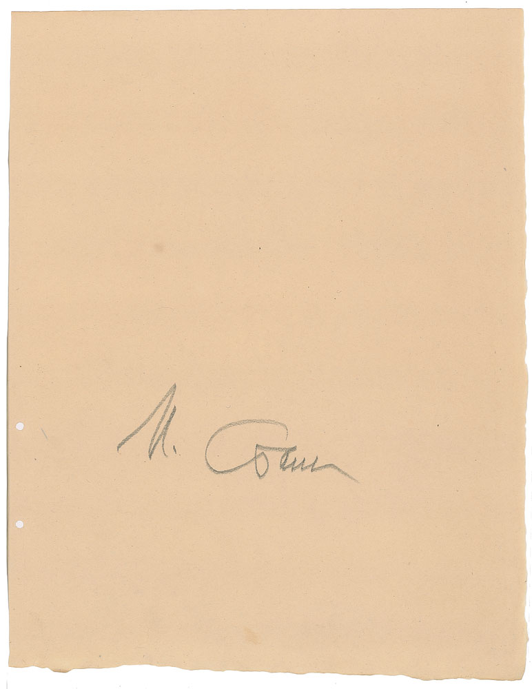 Bold pencil signature of Joseph Stalin in Cyrillic on an off-white 9 x 11.75 page removed from a guest book deriving from the Hotel Radium Palace in Jahymov, Czechia, which contained signatures from an assortment of dignitaries between the years 1927 and 1947. In fine condition. Accompanied by images of the guest book from which the page originates, which also included the likes of Marie Curie, Feodor Chaliapin, and Klement Gottwald.