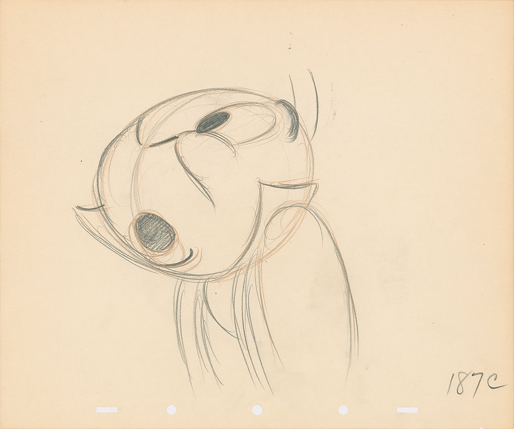 (Walt Disney Studios, circa 1943) Original rough production drawing featuring Jiminy Cricket from a WWII cartoon short, showing him in a large close-up pose. Accomplished in graphite and colored pencil on untrimmed 12 x 10 animation paper. Image measures 6.5 x 7. In fine condition. Learn more about our Animation Expert Harry Kleiman