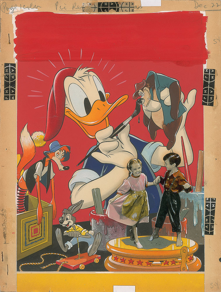 (Walt Disney Studios, 1946) Highly unusual original hand-painted original advertising artwork prepared by the Disney studio for Song of the South toys to be released for Christmas 1946. The artwork portrays Donald Duck wearing a Santa hat as he paints a Br'er Bear doll, and also depicts a Br'er Rabbit pull-toy, Br'er Fox jack-in-the-box, and a Bobby Driscoll/Luana Patten music box. An annotation to the upper right indicates a release date of December 22nd. Accomplished in gouache on an 11 x 14.75 board, with an overlaid cel bearing affixed photographs of the two child actors. In fine condition. Learn more about our Animation Expert Harry Kleiman