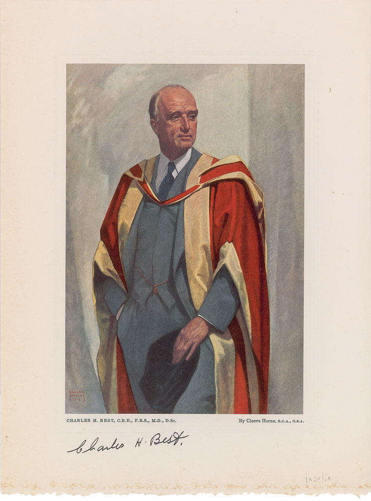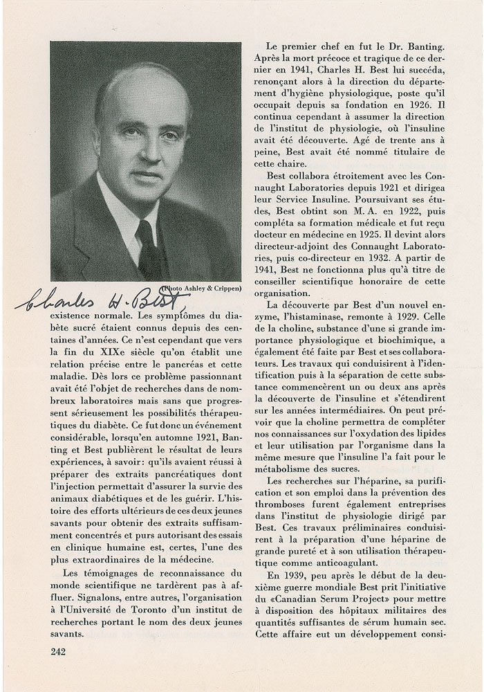 Medical scientist (1899-1978) who co-discovered insulin in 1921. Three items signed in ballpoint or ink by Best: a souvenir card FDC, 5 x 6.5, with a cachet honoring the Doctors of America, postmarked June 9, 1947, Atlantic City; a page removed from a French book, 6.75 x 9.5, which bears a bust-length image of Best; and a color semi-glossy 4.75 x 7 photo of an artistic depiction of Best, signed on the mount and housed in the original Faculty of Medicine, University of Toronto presentation folder. In overall fine condition.