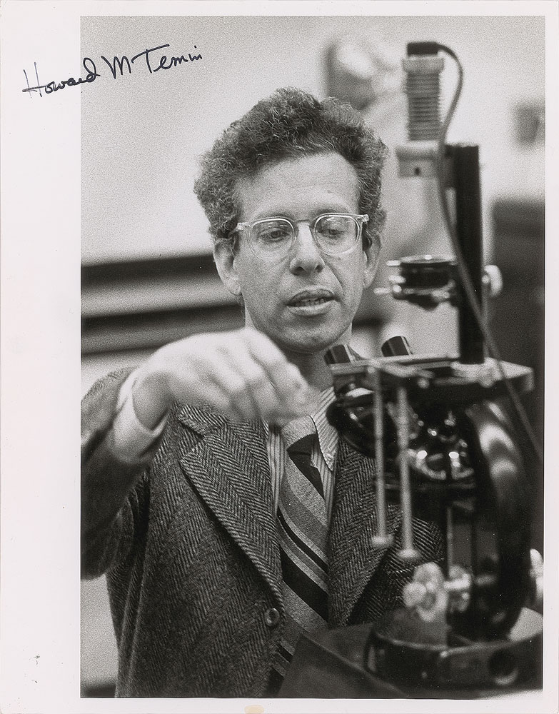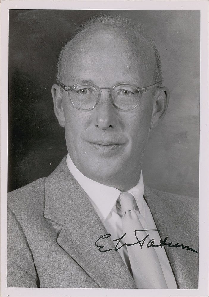 Two items: a glossy 5 x 7 photo of Edward Tatum, who shared the Nobel Prize in Physiology or Medicine in 1958 for showing that genes control individual steps in metabolism, signed in black ink, "E. L. Tatum"; and a glossy 8 x 10.25 photo of Howard Martin Temin, who discovered reverse transcriptase and shared the 1975 Nobel Prize in Physiology or Medicine, signed in black felt tip, "Howard M. Temin." In overall fine condition.