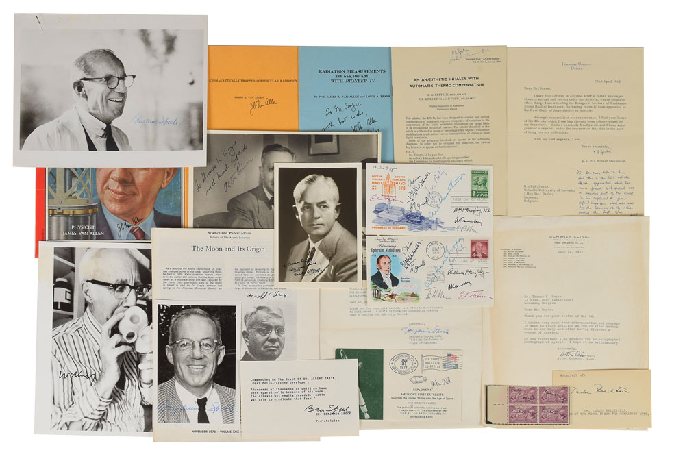 Collection of 19 items signed in ink or felt tip by one or more notable scientists, including: H. G. Epstein (2; pamphlet also signed by Robert Macintosh), Willem Johan Kolff, Charles William Mayo (2), Alton Ochsner (2), Tadeusz Reichstein, Benjamin Spock (4), Harold C. Urey, and James A. Van Allen (4). Also includes two FDCs, both signed in various ink types by Peter Medawar, Walter Rudolf Hess, Francois Jacob, Albert Szent-Gyorgyi, Georg von Bekesy, Edward Tatum, Charles B. Huggins, William P. Murphy, Edgar Adrian, and Arthur Kornberg. In overall very good to fine condition.