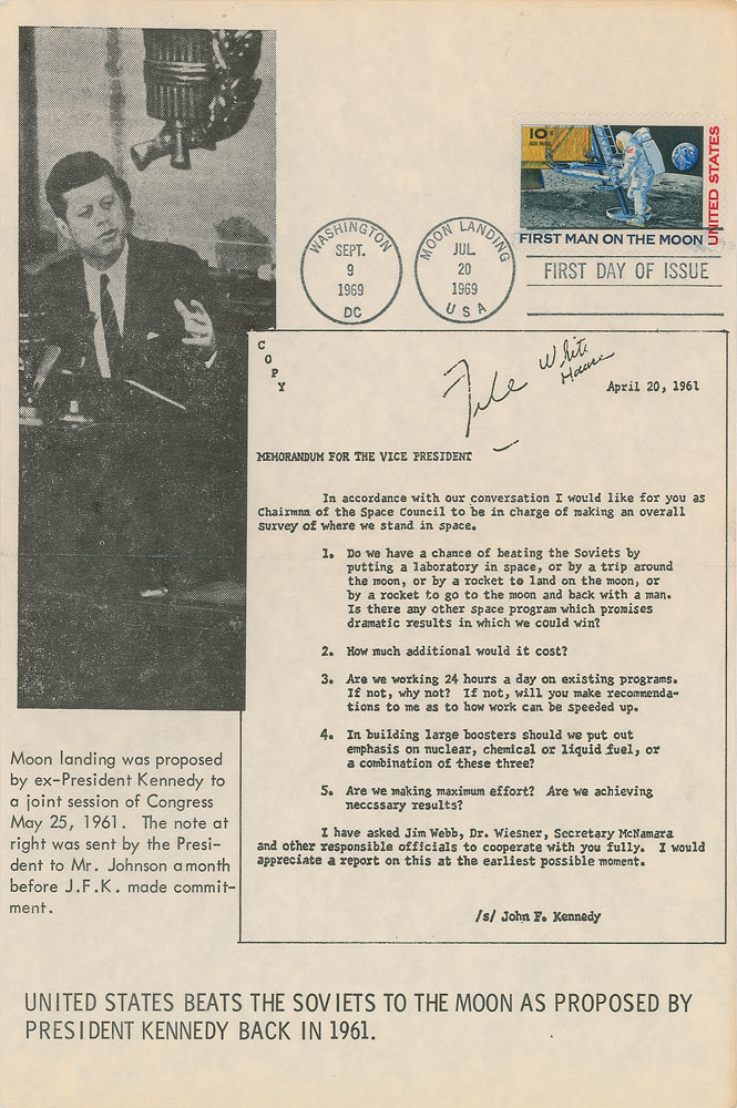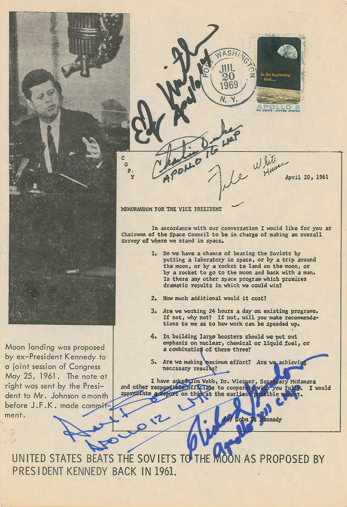 Uncommon 6.75 x 10 broadsheet containing President Kennedy’s typed memorandum to Vice President Johnson, April 20, 1961, posing questions related to the nascent space race and possible lunar voyages, signed in black felt tip, “Edgar Mitchell, Apollo 14” and “Charlie Duke, Apollo 16 LMP,” and in blue felt tip, “Alan Bean, Apollo 12 LMP” and “Richard Gordon, Apollo XII CMP.” The sheet is postmarked July 20, 1969, and bears an Apollo 8 ‘Earthrise’ stamp, as well as an image of Kennedy giving a speech to Congress on May 25, 1961. Includes an additional broadsheet of Kennedy’s memorandum, with this example bearing a “First Day of Issue” stamp, postmarks dated to September 9 and July 20, 1969, and a 10-cent “First Man on the Moon” stamp. In overall fine condition. Consignor notes that the signatures were obtained in person at Spacefest in San Diego, California, in February 2009.