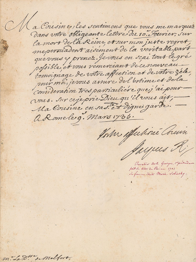James Francis Edward Stuart (1688-1766), son and successor of James II, who claimed the English, Scottish and Irish thrones (as James III of England and Ireland and James VIII of Scotland) upon the death of his father in 1701. LS in French, signed “Jacques R,” one page, 7.75 x 10, March 1735. Letter to his cousin, the Duchess of Melfort. In part (translated): "The very kind words you wrote in your letter of 10 February to console me in my grief upon my death of the Queen made it obvious that you care very much. I am deeply touched by this, and most grateful for this new token of your affection and love for me." In fine condition, with light toning and soiling.