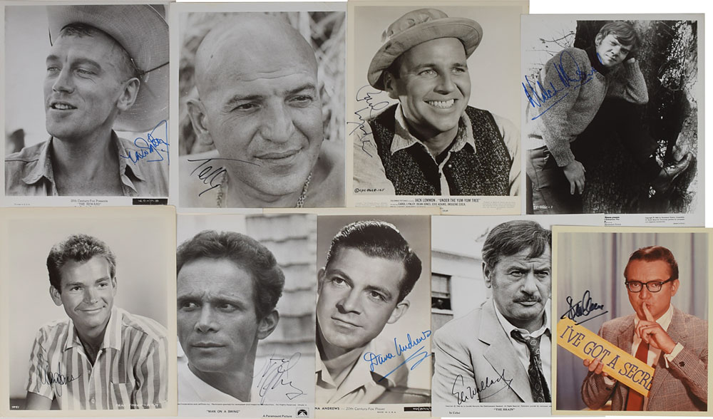 Collection of nine glossy photos of actors, mostly 8 x 10, each signed in felt tip, including: Max von Sydow, Telly Savalas, Eli Wallach, Paul Lynde, Steve Allen, Malcolm McDowell, Dana Andrews, Dean Jones, and Joel Grey. In overall fine condition, with some minor corner creasing and slightly trimmed edges to a few photos.