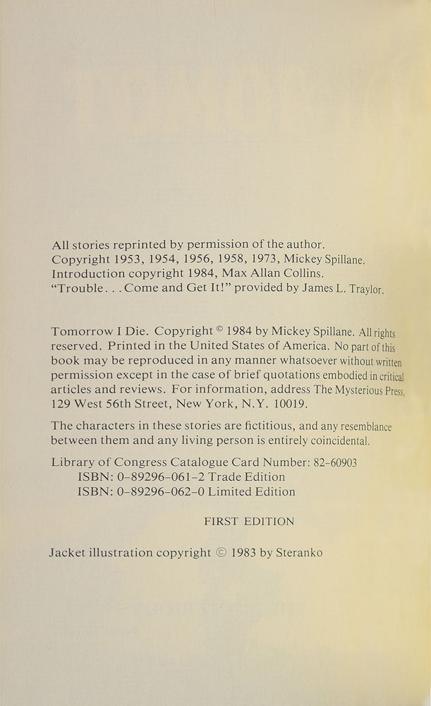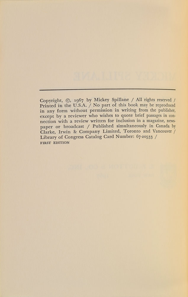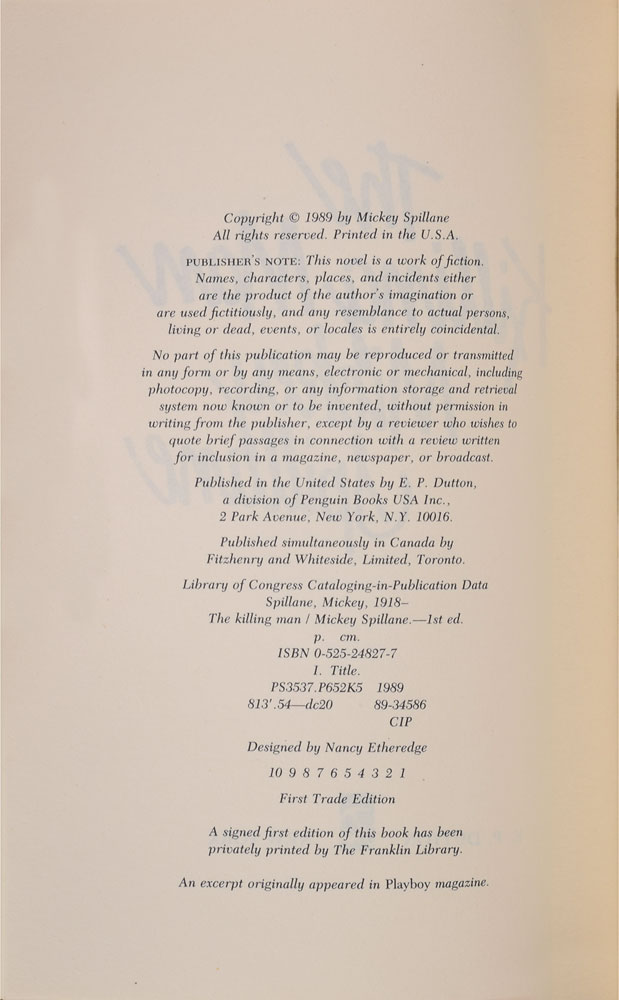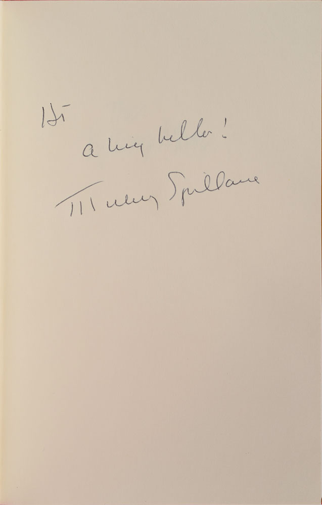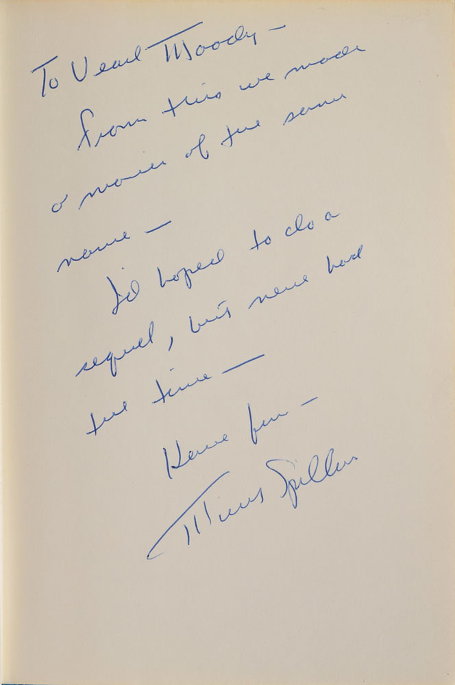 Group of three first edition books (two signed), all hardcovers with dust jackets, including: The Delta Factor, published by E. P. Dutton in 1967, signed and inscribed on the first free end page in ballpoint, "To Verne Moody—from this we made a movie of the same name—I'd hoped to do a sequel, but never had the time—Have fun—Mickey Spillane"; The Killing Man, first trade edition published by E. P. Dutton in 1989, signed on the first free end page in ballpoint, "Hi—a big hello! Mickey Spillane;" and an unsigned first edition of Tomorrow I Die, published by The Mysterious Press in 1984. In overall fine condition.