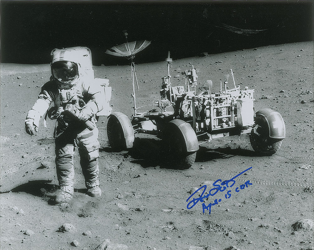 Semi-glossy 10 x 8 photo of Scott near the lunar rover on the surface of the moon, signed in blue felt tip, “Dave Scott, Apollo 15 CDR.” In fine condition with a faint upper left corner bend. Accompanied by a certificate of authenticity from Novaspace.