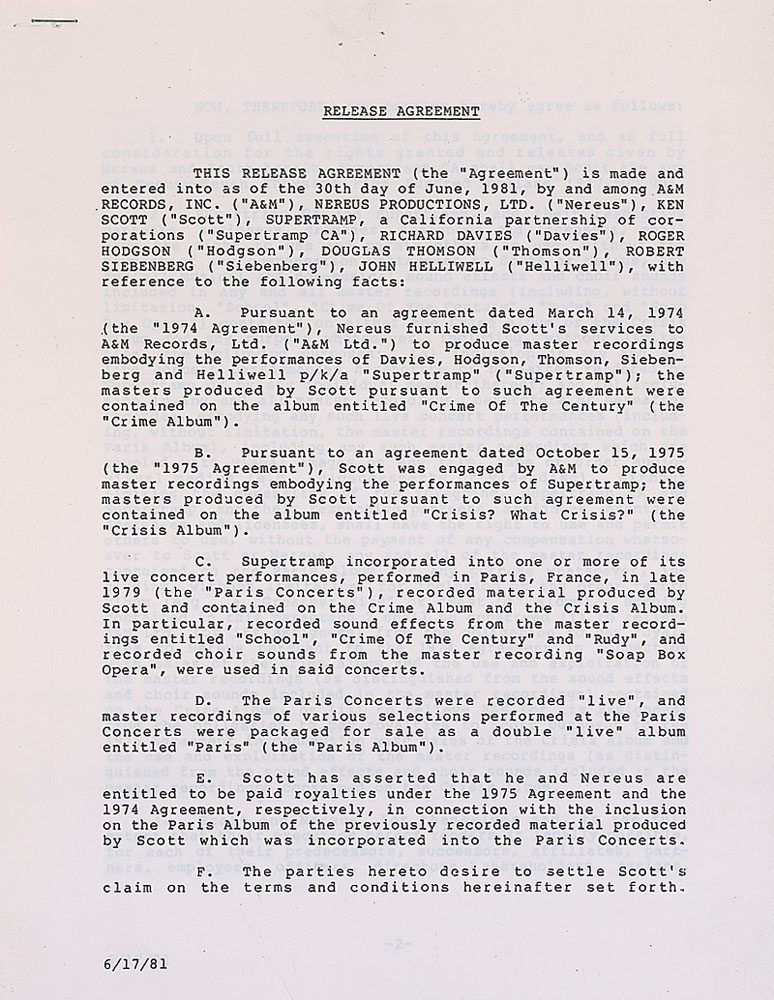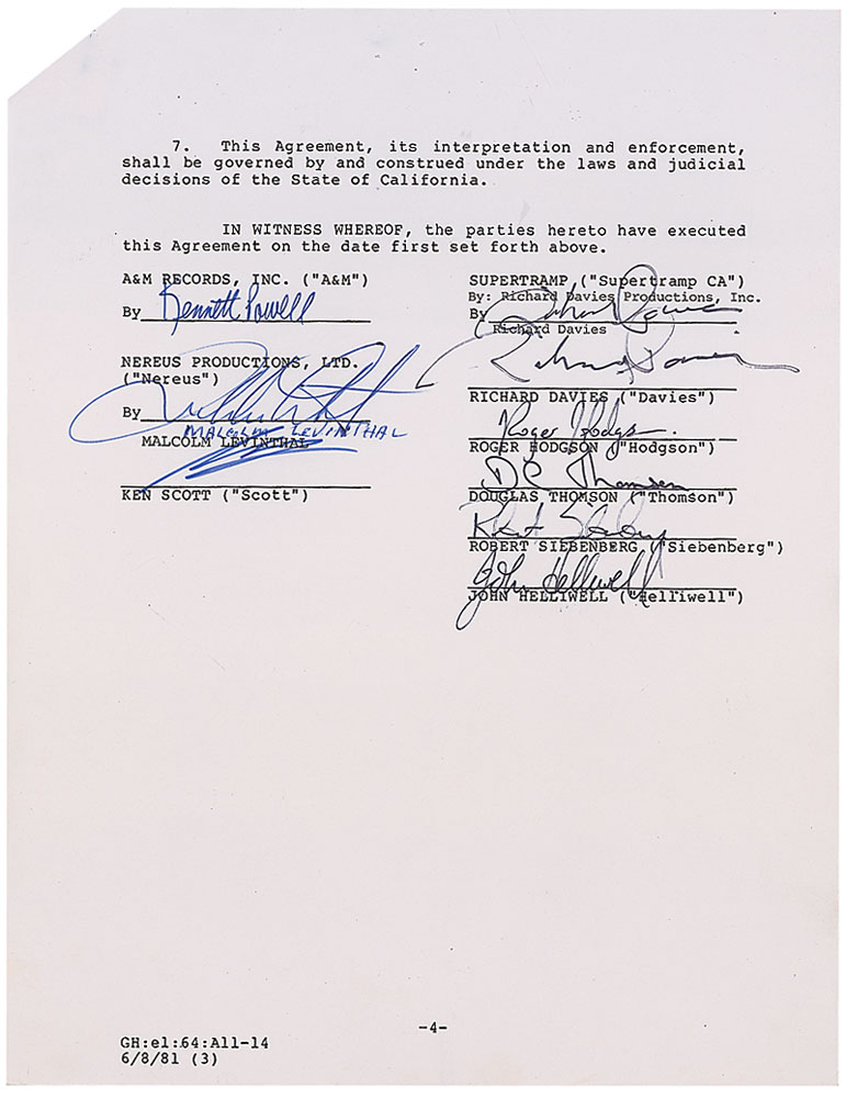 DS, four pages, 8.5 x 11, June 30, 1981. Agreement regarding a payment to record producer Ken Scott. In part: "Scott was engaged by A&M to produce master recordings embodying the performances of Supertramp; the masters produced by Scott…were contained on the album entitled 'Crisis? What Crisis?'…Supertramp incorporated into one or more of its live concert performances, performed in Paris…recorded material produced by Scott…In particular, recorded sound effects from the master recordings entitled 'School,' 'Crime of The Century,' and 'Rudy'…the parties hereby agree…Supertramp CA shall pay Scott the sum of…$27,500." Signed at the conclusion by Roger Hodgson, John Helliwell, Dougie Thomson, Rick Davies (2), and Bob Siebenberg, and countersigned by Scott and two music executives. In fine condition. Accompanied by a letter of authenticity from Perry Cox.