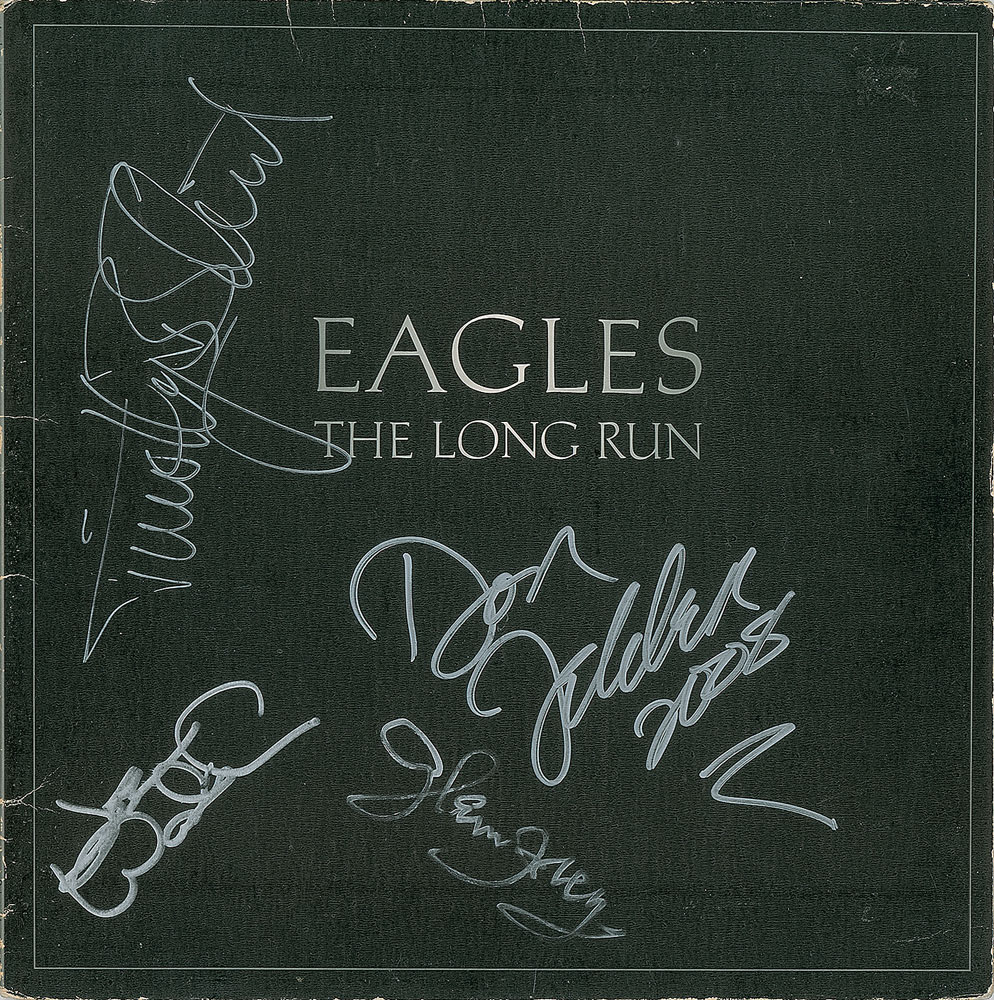 The Long Run album signed on the front cover in silver ink by Glenn Frey, Joe Walsh, Timothy B. Schmit, and Don Felder, who adds, "2008." In fine condition, with creasing and wear to edges. The record is included. This was the first Eagles album to feature Timothy B. Schmit, and featured the hit singles 'Heartache Tonight,' 'The Long Run,' and 'I Can't Tell You Why.'