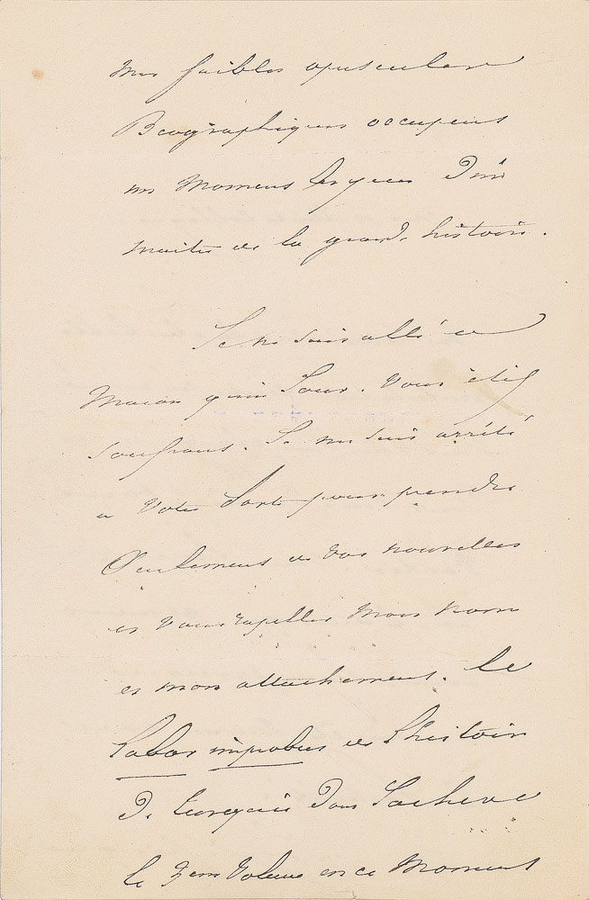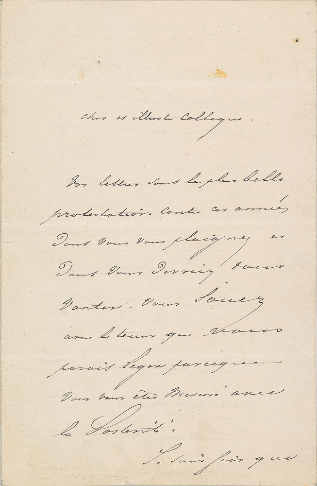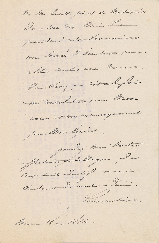 French writer (1790-1869) best known for his autobiographical poem 'The Lake,' who also worked as a diplomat and politician in the Second Republic. ALS in French, signed “Lamartine,” three pages on two adjoining sheets, 5.25 x 8, May 28, 1854. Letter to a "Dear and Illustrious Colleague," in part (translated): "Your letters are the most beautiful protestation against these years which were complaining and of which you ought to boast…I am proud that my weak biographical pamphlets occupy a momentum of genius of a master of the great history…I had stopped at your door only to get news from you and to mention to you my affection. The Labor Improbus is the history of Turkey, the 3rd volume now takes away every morning of my life…reserve for me your affection of colleague, of adopted compatriotism, but, above all, of master and of friend." In fine condition, with light offset of a typed translation lightly showing through from the reverse of the last page. Accompanied by a full translation and engraved portrait bearing a facsimile signature.