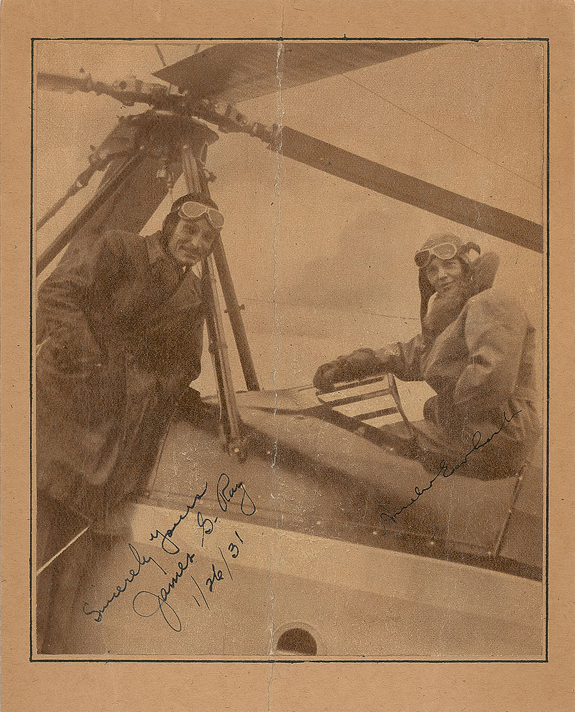 Vintage 4.75 x 5.5 newspaper photo of Earhart and fellow pilot James G. Ray posing with a Pitcairn-Cierva PCA-2, signed in fountain pen, "Amelia Earhart" and "Sincerely yours, James G. Ray, 1/26/31." In very good to fine condition, with a moderate central vertical crease. This photo is of Earhart’s first flight in an autogyro at Willow Gove, Pennsylvania, on December 19, 1930. The PCA-2, which looked like a plane with helicopter blades, was the first rotary-wing aircraft to achieve type certification in the US. Ray landed an autogyro plane on the South Lawn of the White House on April 22, 1931.