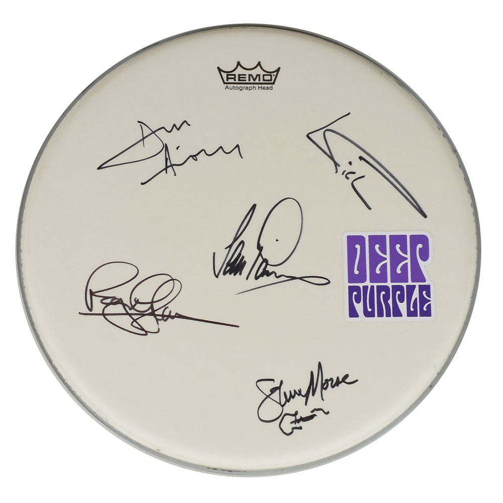 Off-white coated Remo Autograph drum head, 14.5″ in diameter, signed in black felt tip by Roger Glover, Ian Paice, Ian Gillan, Don Airey, and Steve Morse, who adds a small guitar. Lower portion bears an affixed Deep Purple sticker. In fine condition.