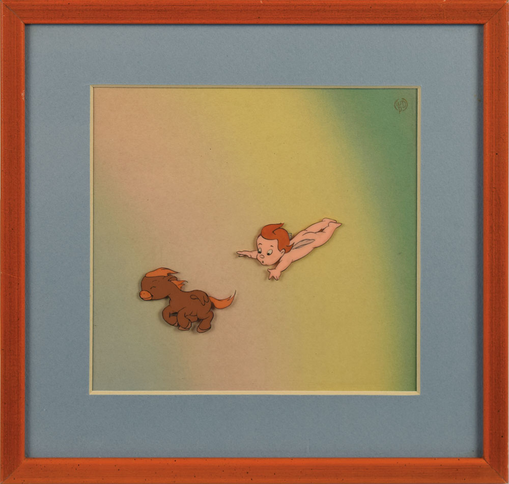 (Walt Disney Studios, 1940) Original production cel featuring Baby Pegasus and a Cherub from Fantasia, showing them in the 'Pastoral Symphony' segment. The cel has been applied to an airbrushed background as prepared by Courvoisier Galleries for sale. Character images each measure about 2 x 1.25, with a mat opening of 6.5 x 6. Framed to an overall size of 10 x 9.5. In fine condition. Learn more about our Animation Expert Harry Kleiman
