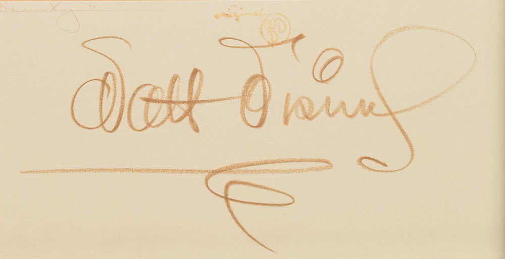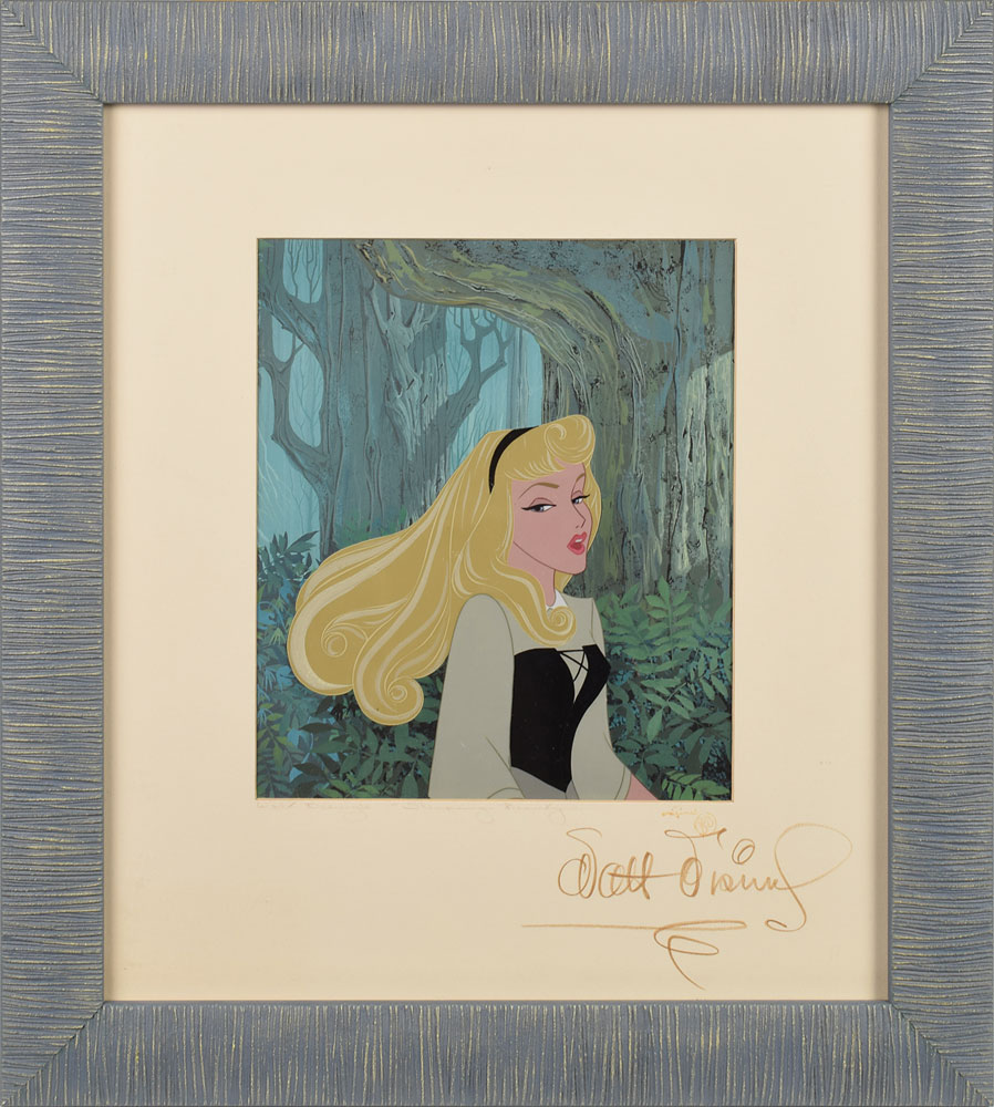 (Walt Disney Studios, 1959) Amazing original production cel featuring Briar Rose from Sleeping Beauty, showing the film's famed protagonist in the forest. The cel is placed on a hand-painted partial production background attributed to Eyvind Earle. Displayed in its original mat prepared by the Art Props Department at Disney Studios, which is signed in brown artist's crayon by Walt Disney. Image measures 6.5 x 6.5, with a mat opening of 8.25 x 9.5. Below the opening is a calligraphic caption, "Walt Disney's 'Sleeping Beauty,'" and an "Original WDP" stamp. Framed to an overall size of 17 x 19. In fine condition. An absolutely breathtaking set-up boasting every sought-after attribute—a large character image, an original hand-painted Eyvind Earle background, and a perfect Disney autograph. Learn more about our Animation Expert Harry Kleiman