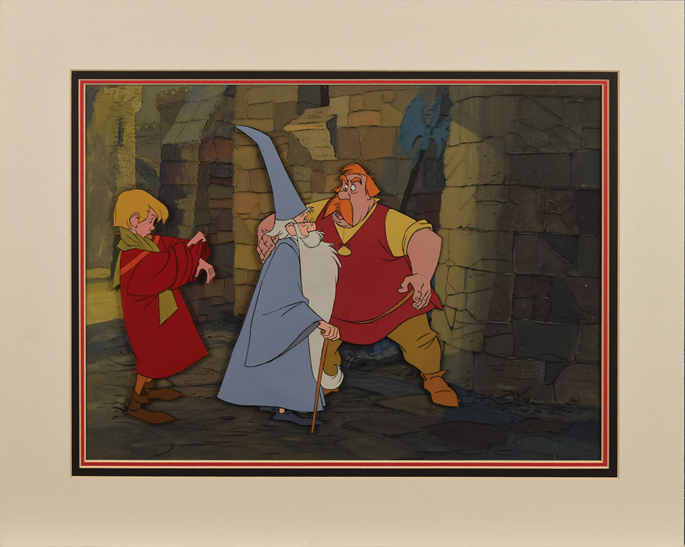 (Walt Disney Studios, 1963) Fantastic original production cel and production background from The Sword in the Stone, showing King Arthur, Merlin, and Sir Ector conversing within the castle courtyard. The cel is placed on a hand-painted production background from the same film. Total image measures 10 x 9, with a mat opening of 15 x 11. Mat dimensions are 20 x 16. In fine condition. With strong colors and a detailed medieval backdrop, this is an exceptional display piece from a decidedly uncommon title. Learn more about our Animation Expert Harry Kleiman
