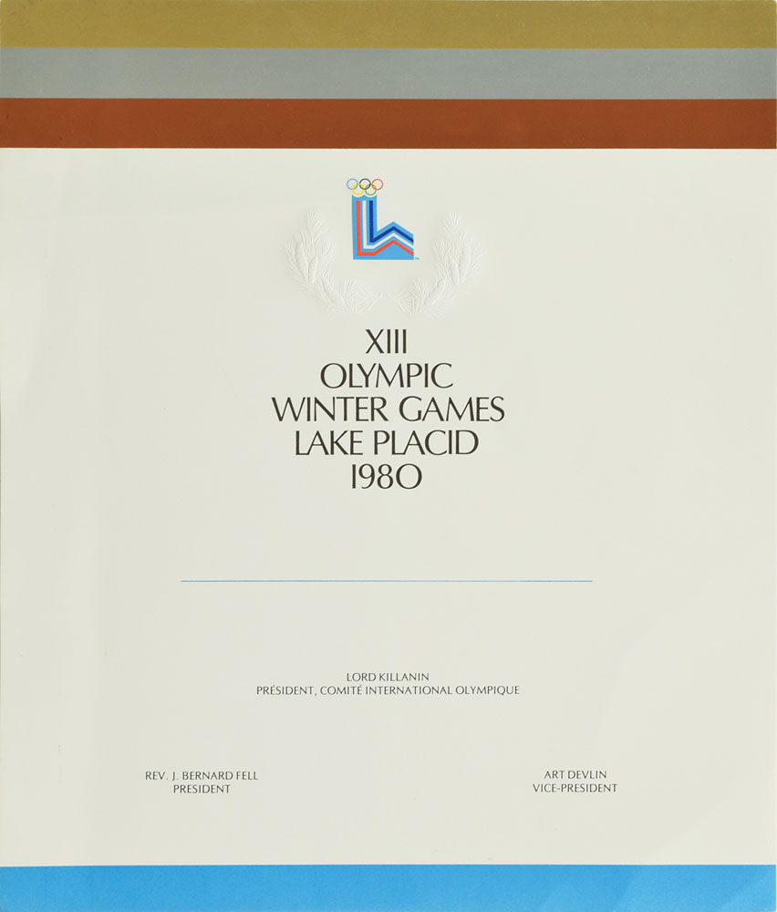 Unissued official winner's diploma from the Lake Placid 1980 Winter Games, one page, 11.75 x 13.75, with blue lower border and upper border consisting of gold, silver, and bronze layers. The central section shows the Lake Placid Games logo with embossed images of pine branches. In fine condition, with a horizontal bend to upper portion.