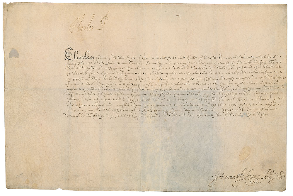 King of England, Scotland, and Ireland (born 1600) from 1625 until his execution in the wake of the English Civil War in 1649. Following the Protectorate rule of Oliver Cromwell and his son, Richard, Charles's line was restored to the throne with the succession of his son, Charles II, in 1660, whose reign was retroactively dated to 1649. Rare manuscript vellum DS, signed “Charles P.,” one page, 13.75 x 9.25, November 22, 1621. Original warrant issued to Sir Adam Newton ordering payment of £79.10.8 "for reparacions of our Stables at the Mewes, St. James Sheene and Richmond," as per the bill subscribed by Sir Thomas Howard, Master of the Horse, for Francis Wethered, Surveyor of the Stables. Signed in the upper portion by Charles, and countersigned below by Francis Crane as auditor general. In fine condition, with two small areas of vellum irregularity. An attractive document signed by the 21-year-old Prince of Wales.