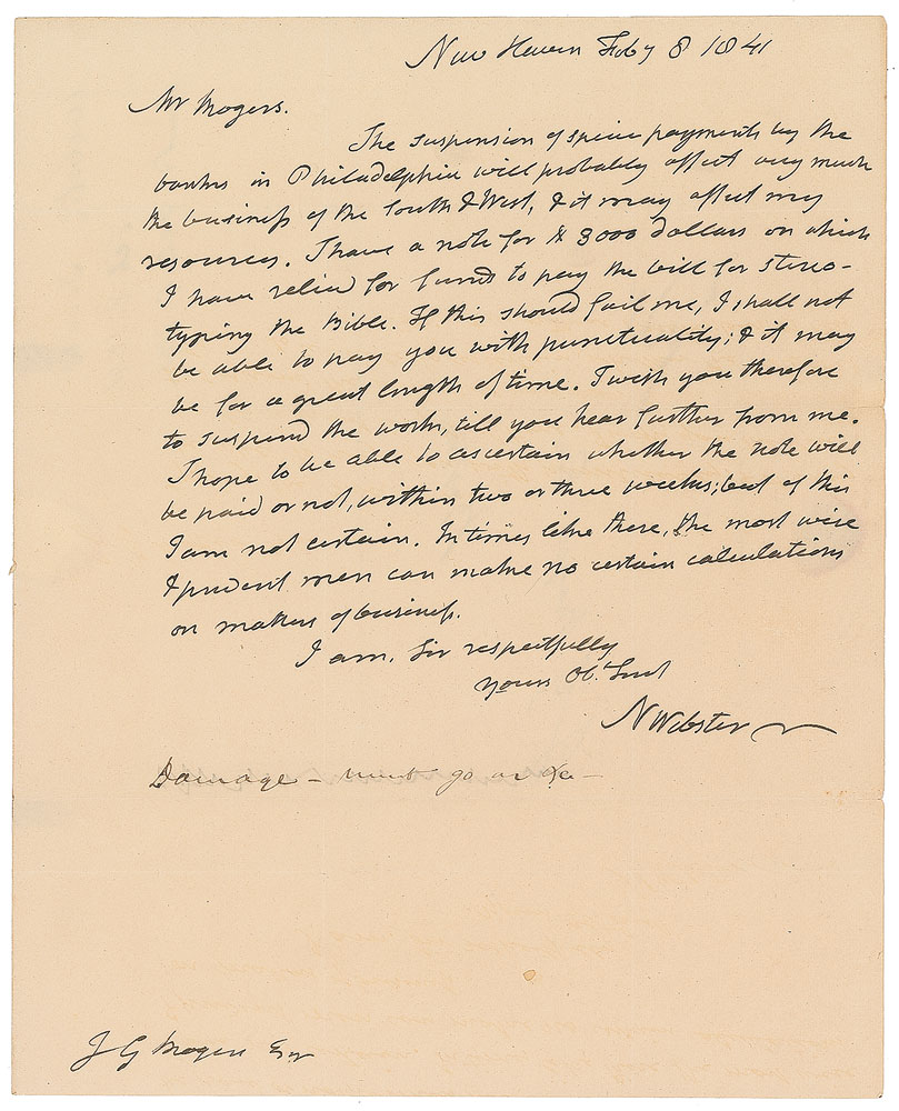 Author and lexicographer (1758-1843) who published the first comprehensive dictionary of American English. ALS signed “N. Webster,” one page, 8 x 9.75, February 8, 1841. Written from New Haven, a letter to J. G. Mogen, in full: "The suspension of specie payments by the banks in Philadelphia will probably affect very much the business of the South & West, & it may affect my resources. I have a note for 3000 dollars on which I have relied for funds to pay the bill for stenotyping the Bible. If this should fail me, I shall not be able to pay you with punctuality; & it may be for a great length of time. I wish you therefore to suspend the work, till you hear further from me. I hope to be able to ascertain whether the note will be paid or not, within two or three weeks; but of this I am not certain. In times like these, the most wise & prudent men can make no certain calculations or matters of business." Addressed on the reverse in Webster's own hand. In fine condition, with scattered light creasing and intersecting folds. Now holding an honored place in the history of American English—as well as being a treasured tool of writers and term paper-writing students—Webster's first dictionary only sold 2,500 copies. He was forced to mortgage his home in order to publish a second edition in 1840-1841, resulting in a life plagued with ceaseless debt.