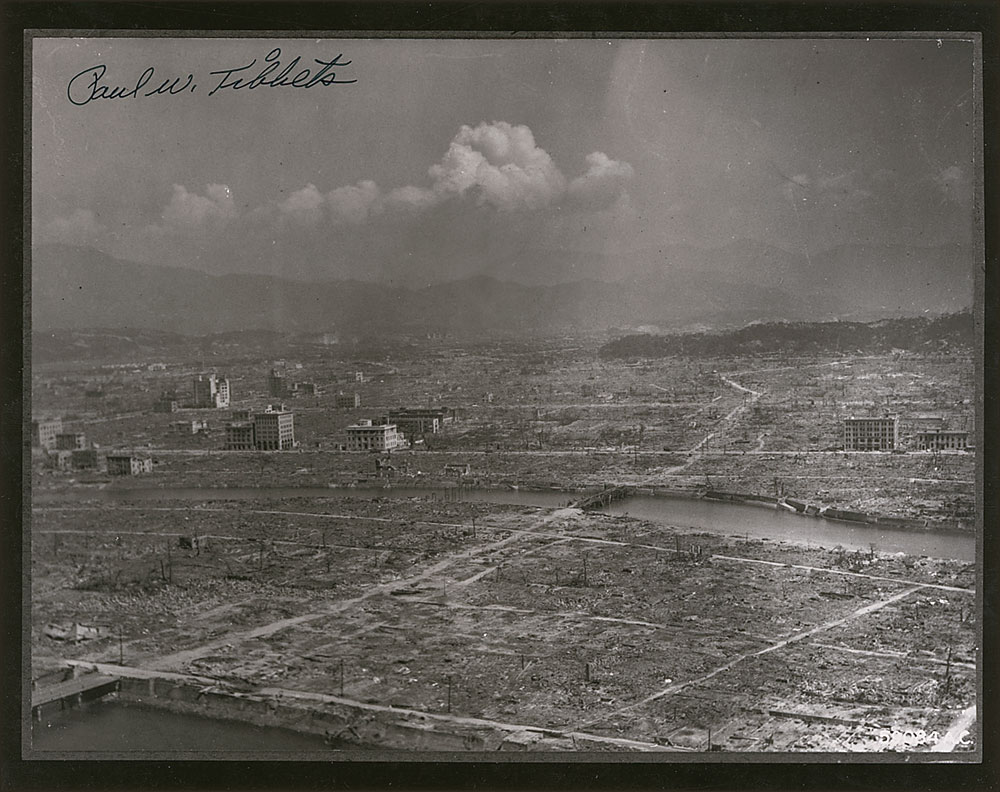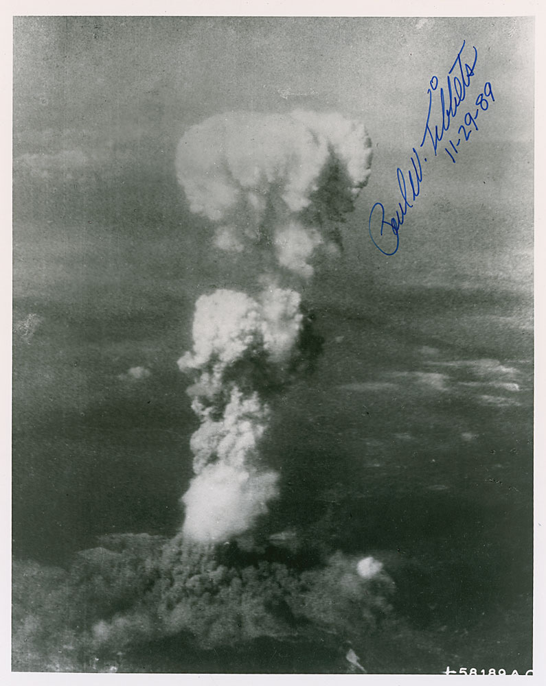 Four items: a glossy 8 x 10 photo of the Hiroshima mushroom cloud, signed in blue felt tip, “Paul W. Tibbets, 11-29-89”; an FDC bearing a cachet honoring Douglas MacArthur, signed in blue ink, "Paul W. Tibbets"; an FDC bearing a cachet honoring the United Nations Non Proliferation of Nuclear Weapons, signed in blue ballpoint, "Paul W. Tibbets"; and a glossy 10 x 8 photo of the destroyed city of Hiroshima, signed in black felt tip, "Paul W. Tibbets." In overall fine condition. Accompanied by full letters of authenticity from PSA/DNA for all four pieces.