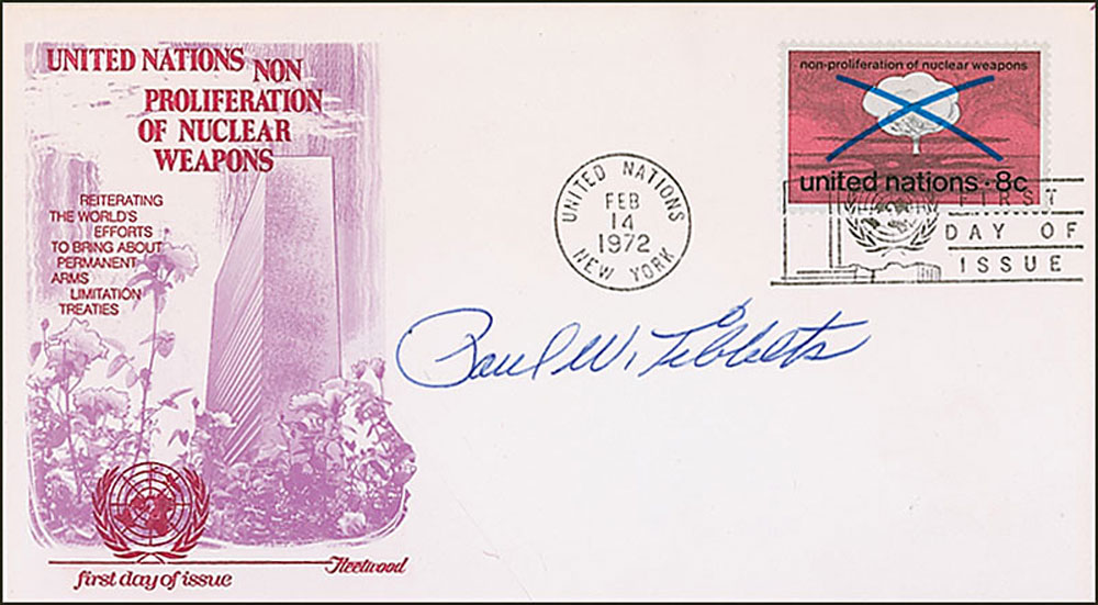 Four items: a glossy 8 x 10 photo of the Hiroshima mushroom cloud, signed in blue felt tip, “Paul W. Tibbets, 11-29-89”; an FDC bearing a cachet honoring Douglas MacArthur, signed in blue ink, "Paul W. Tibbets"; an FDC bearing a cachet honoring the United Nations Non Proliferation of Nuclear Weapons, signed in blue ballpoint, "Paul W. Tibbets"; and a glossy 10 x 8 photo of the destroyed city of Hiroshima, signed in black felt tip, "Paul W. Tibbets." In overall fine condition. Accompanied by full letters of authenticity from PSA/DNA for all four pieces.