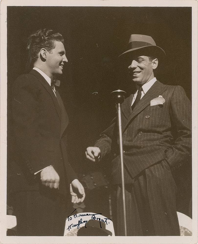 Wonderful vintage glossy 8 x 10 photo of Bogart in a pinstriped suit with bandleader Ozzie Nelson, boldly signed and inscribed in fountain pen, "To Norman, Humphrey Bogart.” In fine condition, with mild surface creases.