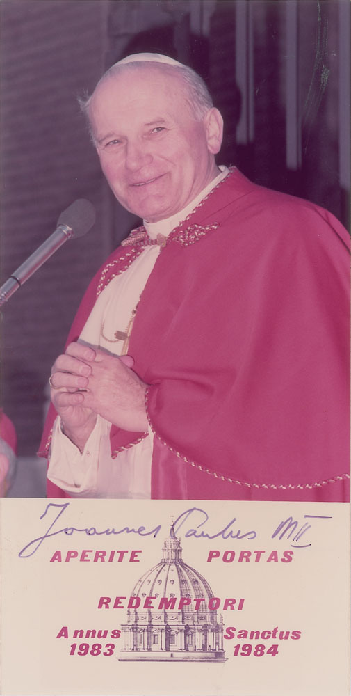 Born Karol Wojtyla in 1920, John Paul II served as the 264th Pontiff of the Roman Catholic Church from 1978 until his death in 2005. Attractive color glossy 3.5 x 6.75 half-length photo of Pope John Paul II smiling in front of a microphone circa 1983-1984, signed in the lower border in thin black felt tip, "Joannes Paulus MII." In fine condition.