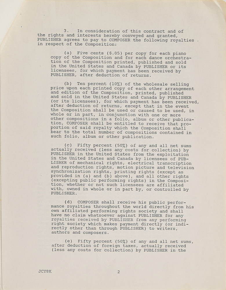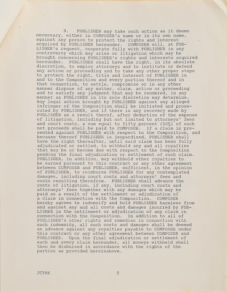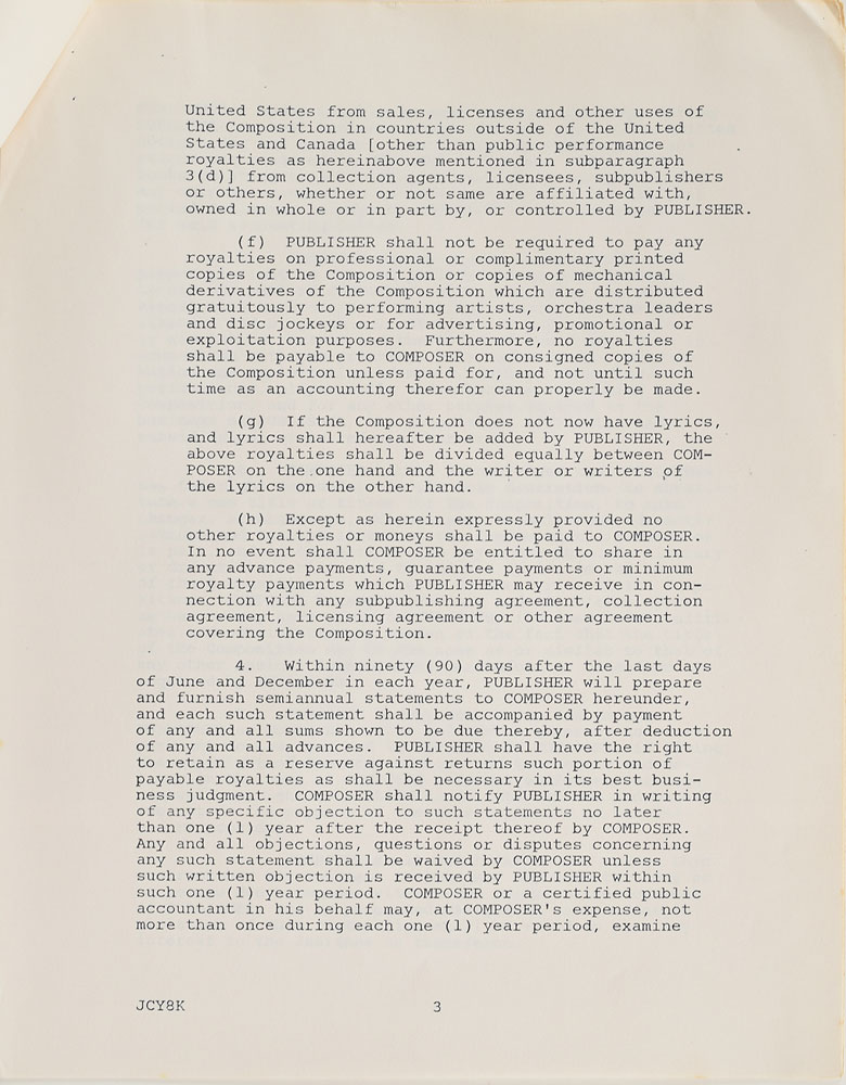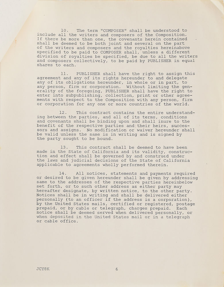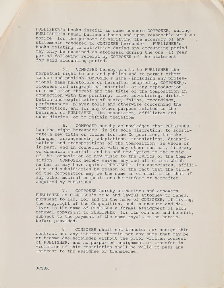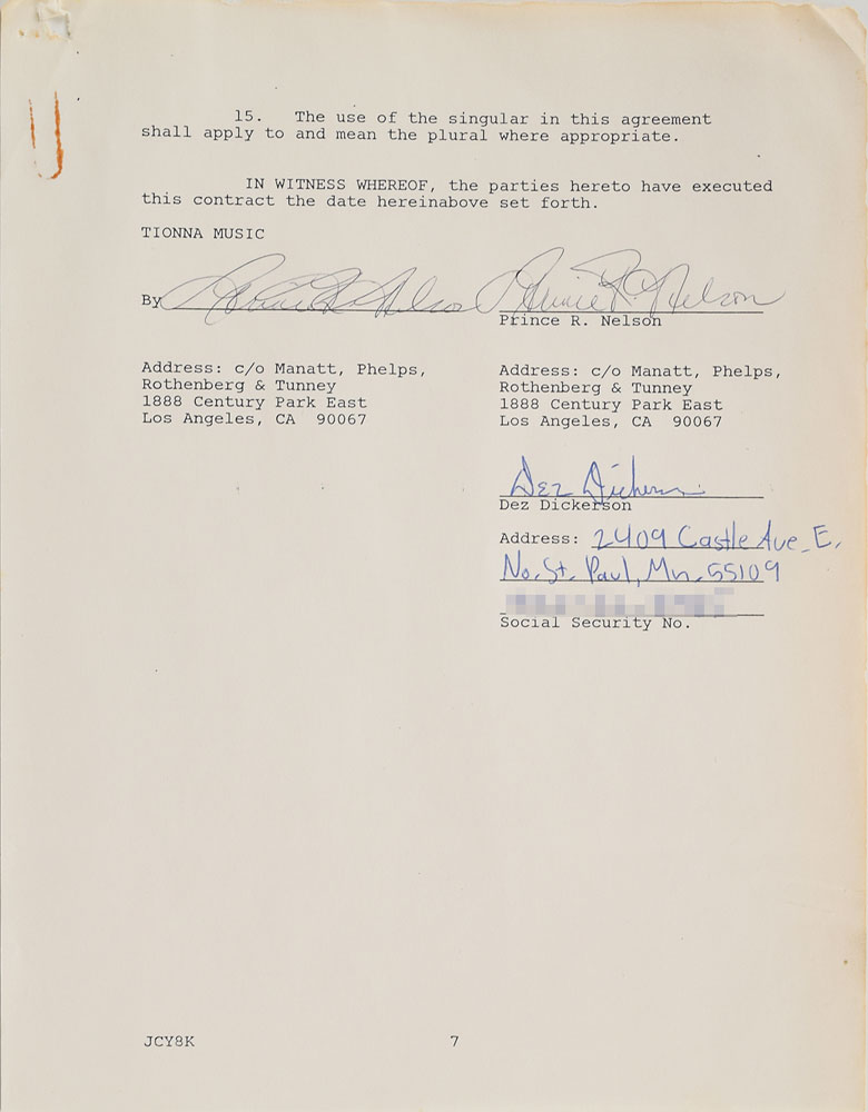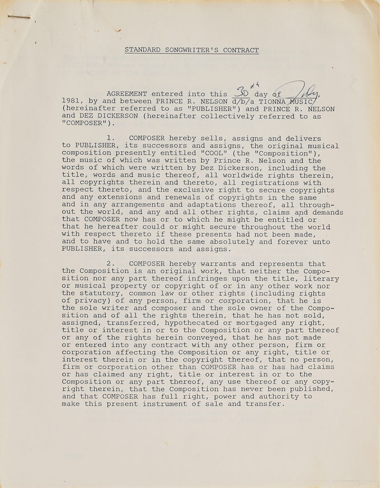 DS, signed twice, “Prince R. Nelson,” seven pages, 8.5 x 11, July 30, 1981. A "Standard Songwriter's Contract" between Prince and Dez Dickerson for the song 'Cool,' in part: "Composer hereby sells, assigns and delivers…the original musical composition presently entitled 'Cool' (the 'Composition'), the music of which was written by Prince R. Nelson and the words of which were written by Dez Dickerson, including the title, words and music thereof, all worldwide rights therein." The contract goes on to outline standard terms and the royalties schedule. Signed at the conclusion twice by Prince—once on behalf of Tionna Music and once as the composer of the song—and signed once by Dickerson, who adds his address. In fine condition, with the final (signed) page detached but present. From the collection of an early Prince insider.