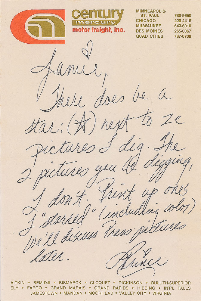 ANS signed “Prince,” one page, 4.75 x 7.25, Century Mercury Motor Freight letterhead, no date. In full: "There does be a star (*) next to ze pictures I dig. The 2 pictures you be digging, I don't. Print up ones I 'starred' (including color). We'll discuss Press pictures later." In fine condition. From the collection of an early Prince insider.