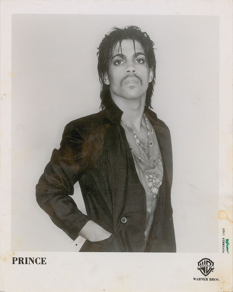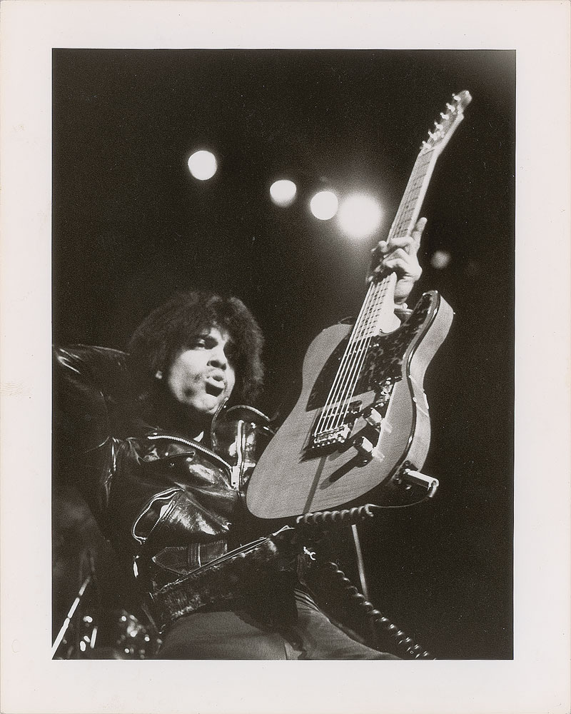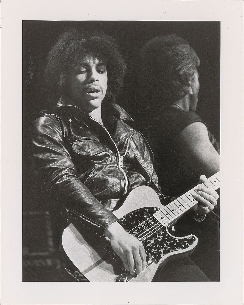 Group of three original vintage glossy 8 x 10 silver gelatin photos of Prince, including: two photos of a leather-clad Prince rocking out on his Telecaster electric guitar, both with "This paper manufactured by Kodak" watermarks on the reverse; and one Warner Bros. Records publicity photo of Prince from November 1980, during the 'Dirty Mind' era. In overall fine condition, with some light stains to the border of the publicity portrait. From the collection of an early Prince insider.