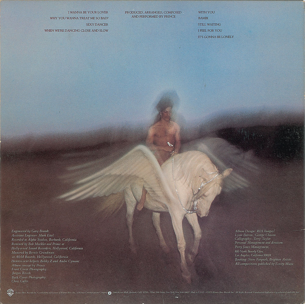 Prince album (Warner Bros. BSK 3366), which names "Steve Fargnoli" in the booking credit on the reverse, and states, "All compositions published by Ecnirp Music," distinguishing it as the first pressing. In fine condition, with slight edgewear. Released in 1979 as Prince's second studio album, this self-titled record features the hits 'Why You Wanna Treat Me So Bad?,' 'Sexy Dancer,' and 'I Wanna Be Your Lover.' From the collection of an early Prince insider. The consignor notes that Prince was unhappy with the unsaturated color tone, and later pressings of the album had more vibrant album artwork.