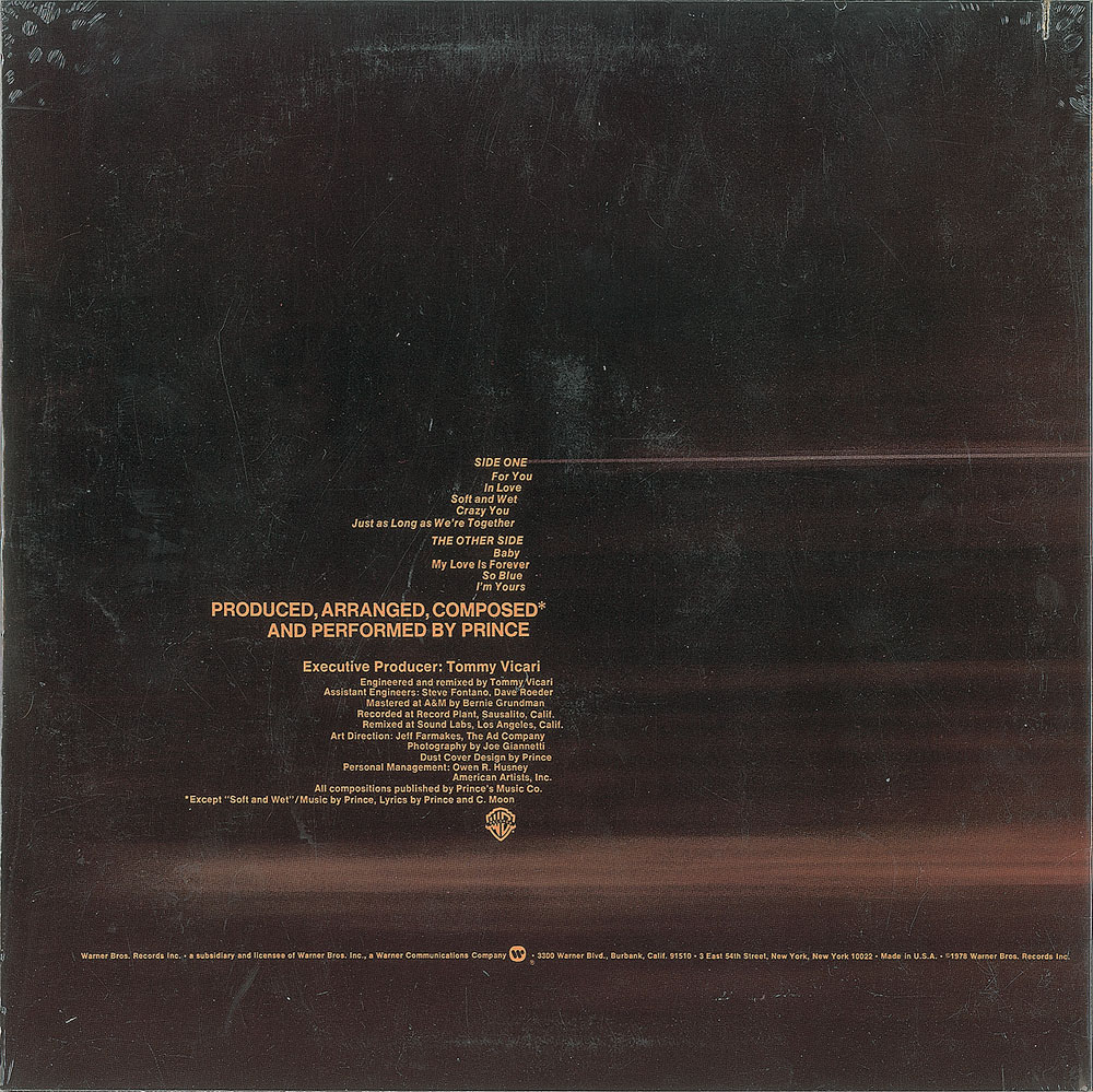 Still-sealed For You album (Warner Bros. BSK 3150), Prince's 1978 debut. The sleeve prominently features the soon-to-be classic line on the reverse, "Produced, Arranged, Composed and Performed by Prince." In fine condition, with a small discount cut to the top edge. From the collection of an early Prince insider.