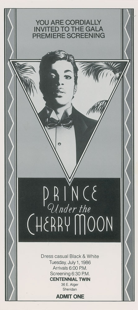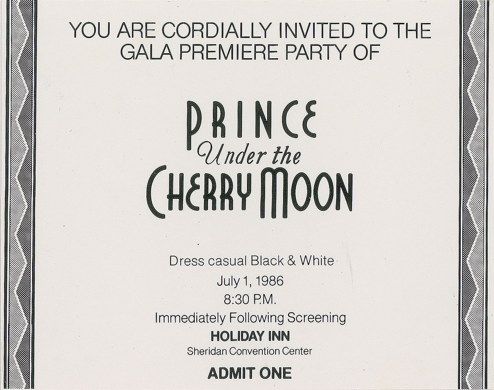 Two invitations related to the debut of Prince's 1986 film Under the Cherry Moon: an invitation to the "Gala Premiere Screening" of Prince's Under the Cherry Moon, 4 x 9, to be held at the Centennial Twin in Sheridan, Wyoming, on July 1, 1986; and an invitation to the "Gala Premiere Party of Prince, Under the Cherry Moon," to be held at the Sheridan Holiday Inn on July 1, 1986, immediately following the screening. In overall fine condition. From the collection of tour crew member Eileen Licitri and accompanied by a letter of provenance.