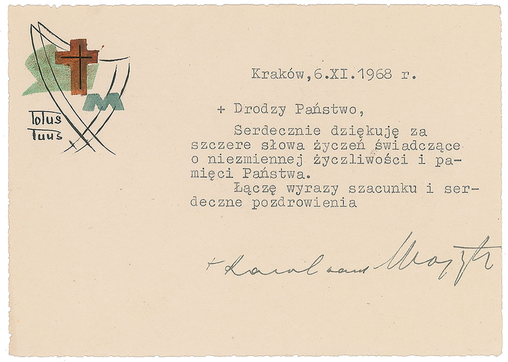 TLS in Polish, signed “Karol card Wojtyla,” one page, 5.75 x 4, illustrated "Totus Tuus" stationery card, November 6, 1968. In full (roughly translated): "I sincerely thank you for your sincere words of witness to the unchanging kindness and remembrance of the State. Great respect and cordial greetings." In fine condition.