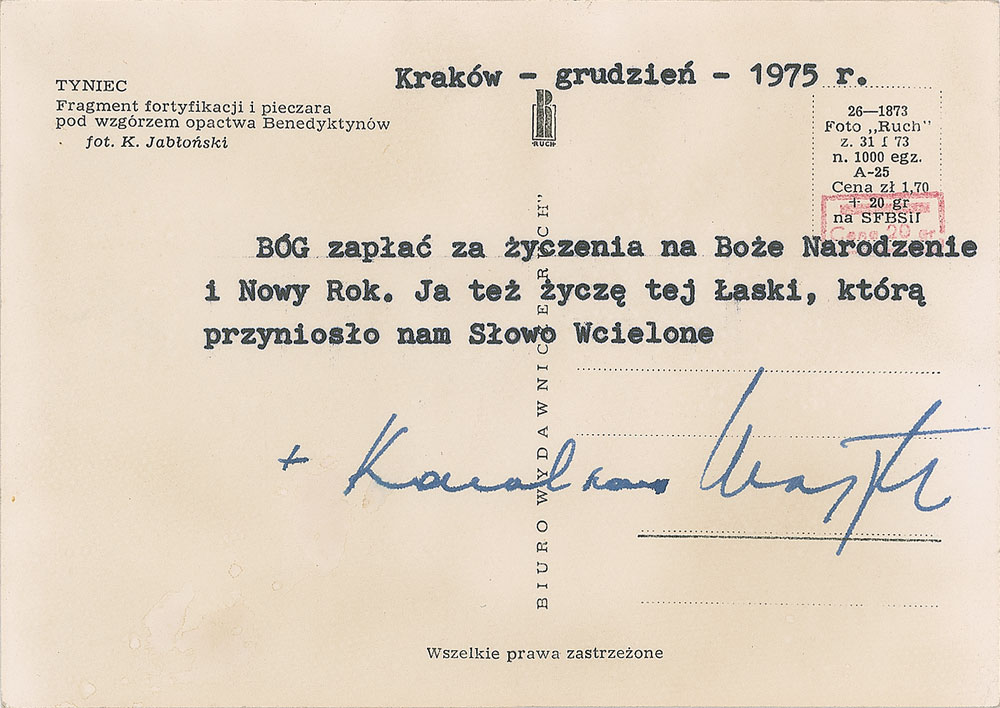TLS in Polish, signed “Karol card Wojtyla,” one page on the reverse of a 5.75 x 4 postcard showing the cavern below the Benedictine Abbey in Tyniec, December 1975. In full (roughly translated): "God pay for Christmas and New Year's wishes. I also wish this Laski, who brought us the Word Incarnate." In fine condition.