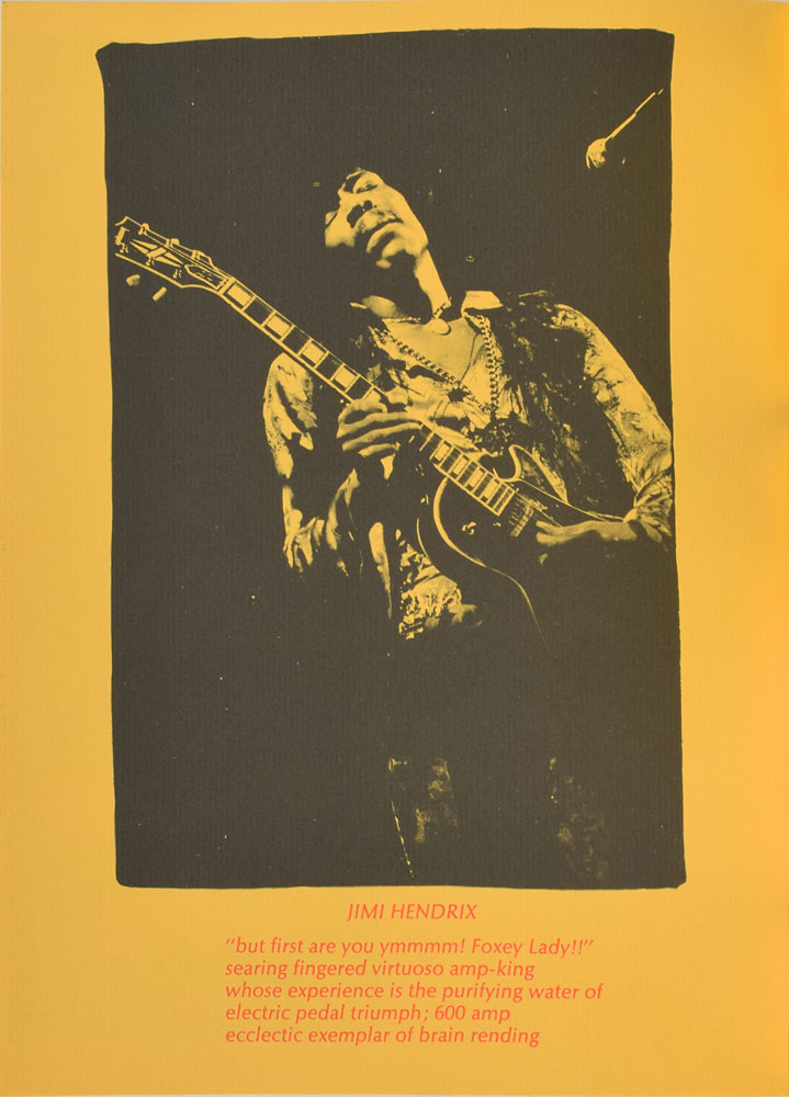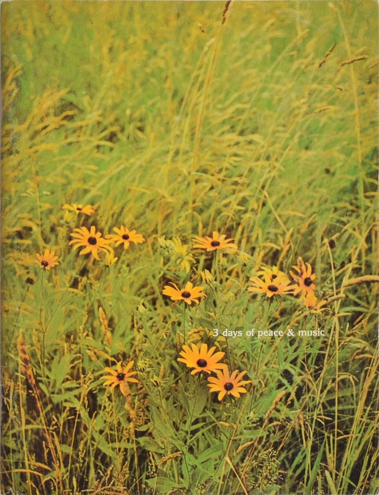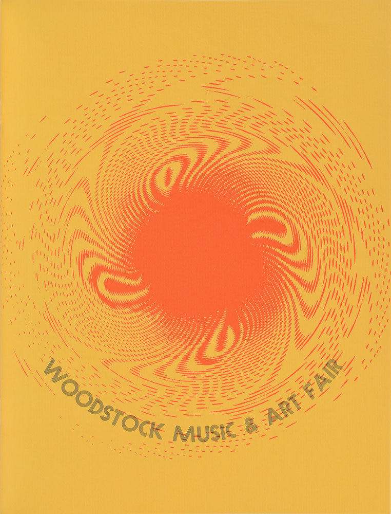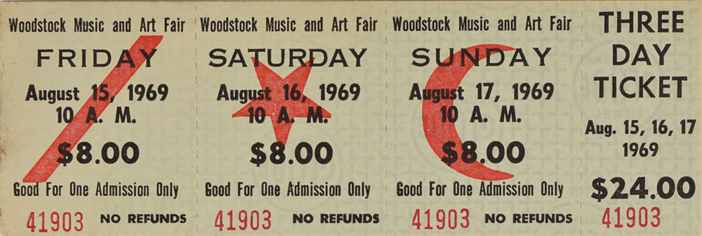 Vintage program for the 1969 Woodstock Music & Art Fair, 8.5 x 11, 50 pages, filled with colorful psychedelic designs and images of the various performers, including: Jimi Hendrix, Janis Joplin, Jeff Beck, Creedence Clearwater Revival, Richie Havens, Grateful Dead, Joe Cocker, Ravi Shankar, and Joan Baez. Also includes an original unused three-day ticket for the Woodstock Music and Art Fair, August 15-17, 1969, 6 x 2, issued as ticket number "41903." In fine condition.
