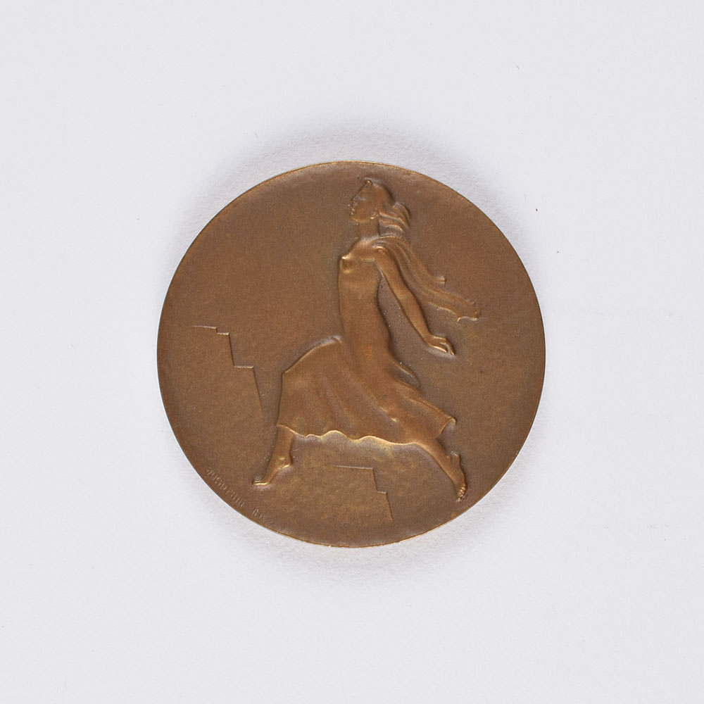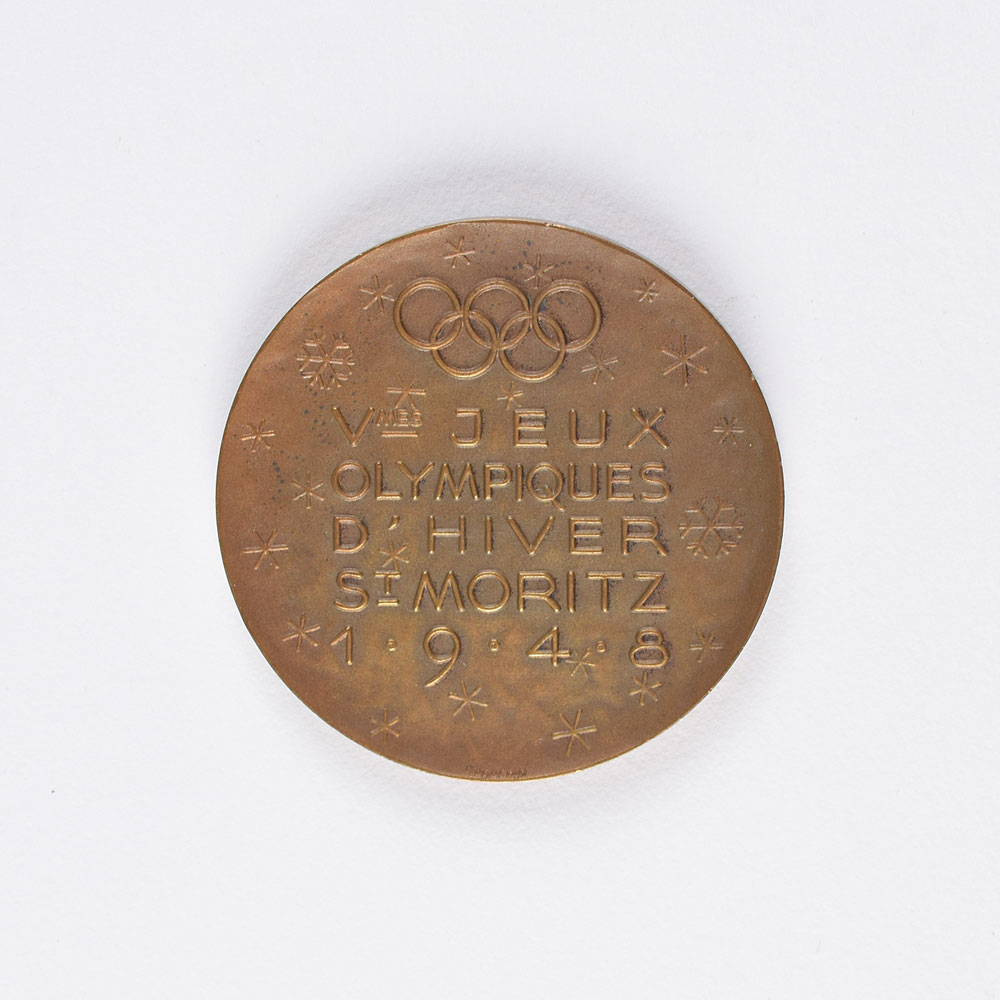 Participation medal issued for the St. Moritz 1948 Winter Olympics. Bronze, 40 mm, 25 gm, by Emil Wiederkehr. The front depicts a symbolic figure of the goddess Victory against a mountain backdrop; the reverse features the Olympic rings above text, "Vmes Jeux Olympiques d'Hiver, St. Moritz, 1948," against a snowflake background.