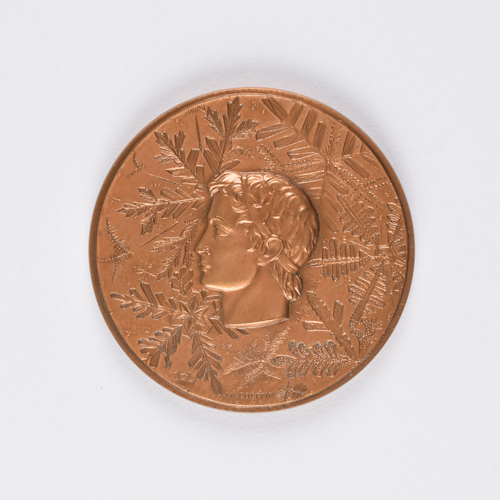 Participation medal issued for the Grenoble 1968 Winter Olympics. Bronze, 68 mm, 158 gm, by J. M. Coeffin. The front depicts a Greek athlete wearing a headband superimposed against a background of snowflakes; the reverse bears the Grenoble Games emblem and a city view with the Belledonne mountain range in the background, with raised text along the bottom, “X Jeux Olympiques D’Hiver.”