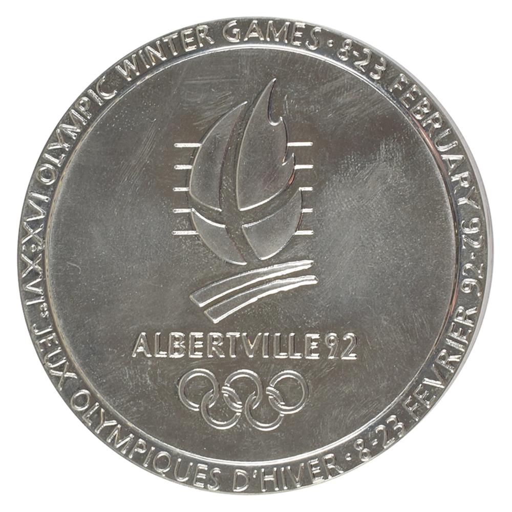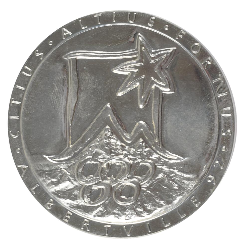 Participation medal issued for the Albertville 1992 Winter Olympics. Chrome-plated steel, 68 mm, 198 gm, by Renee Mayott and struck by the official French Mint, Monnaie de Paris. The front depicts the Albertville Games emblem encircled with French and English text, "XVI Olympic Winter Games 8-23 February 92, XVI Jeux Olympiques D'hiver 8-23 Fevrier 92"; the reverse depicts a star hanging over the Alps and Olympic rings, encircled with the Olympic motto, "Citius, Altius, Fortius, Albertville 92."