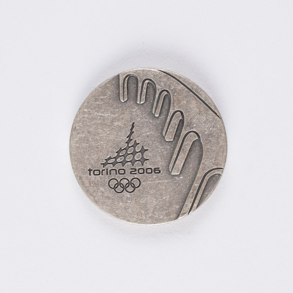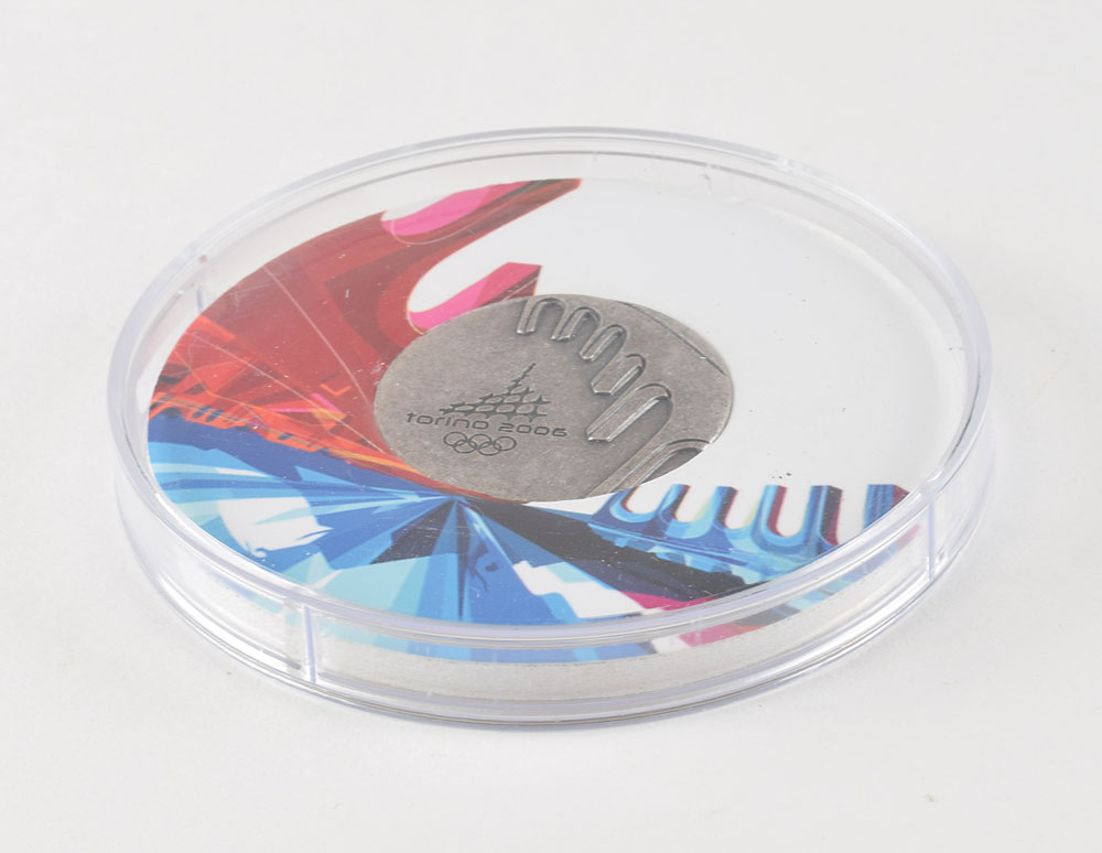 Participation medal issued for the Torino 2006 Winter Olympics. Pewter, 40 mm, 33 gm, by Quatrini. The front depicts the Torino Games emblem with the Aqueduct of Alpignano above; the reverse bears several rays of ice crystals and the Olympic rings and motto below. Complete with its original cardboard and plastic case.