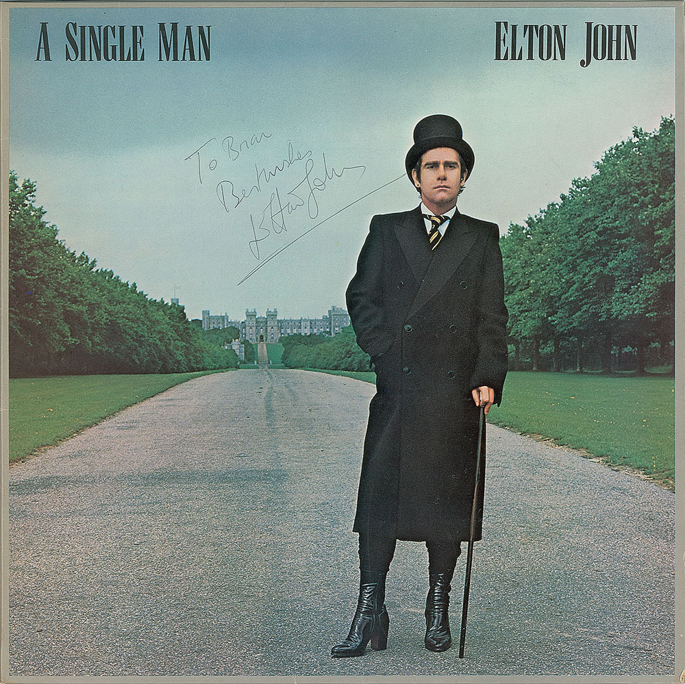 A Single Man album signed and inscribed on the front cover in black ballpoint, "To Brian, Best wishes, Elton John." In fine condition. The record is not included.