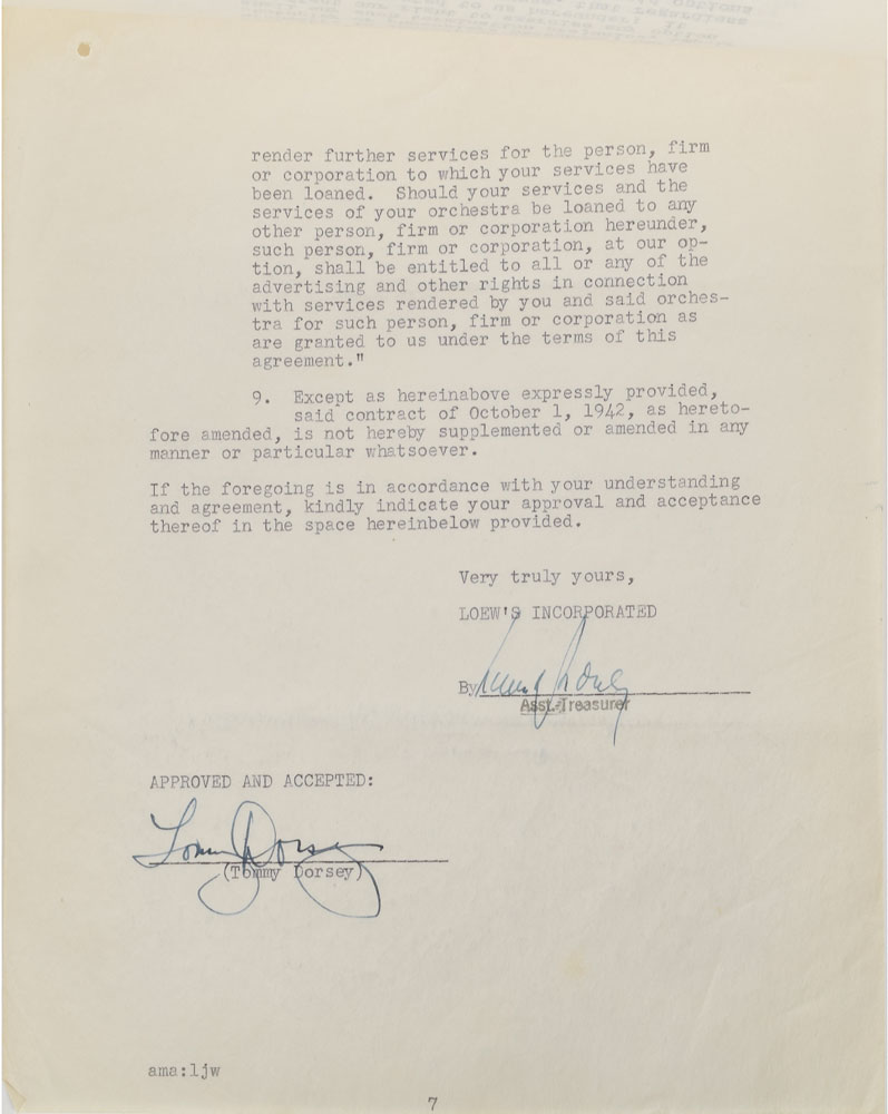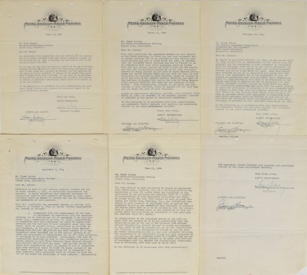 Appealing group lot of five documents, two signed by Tommy Dorsey, and three signed by Jimmy Dorsey, 14 total pages, each approximately measuring 8.5 x 11, dated between 1943 and 1944. In overall fine condition.